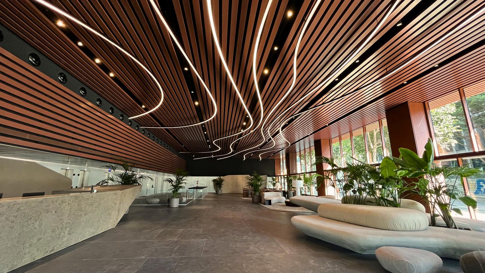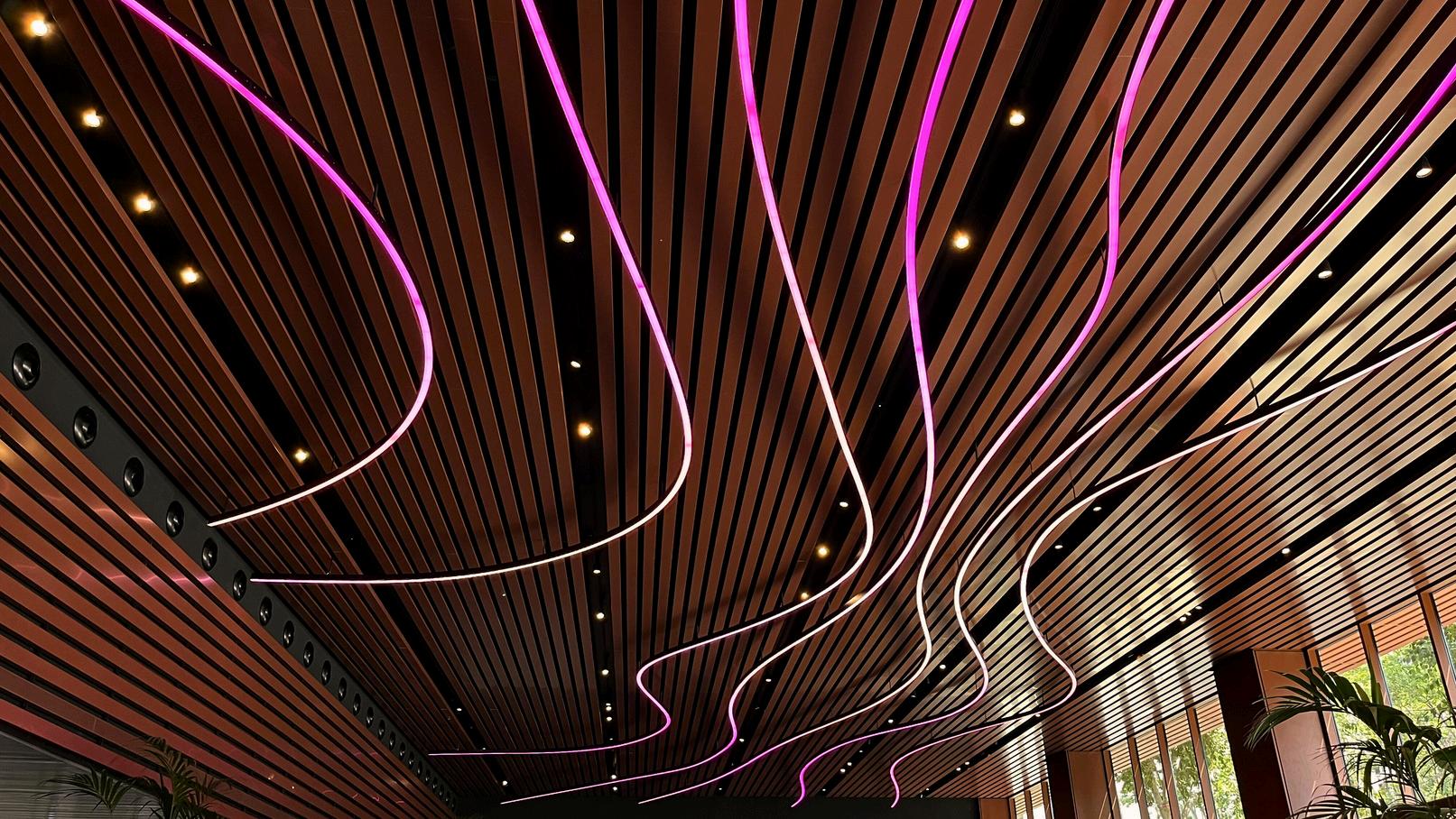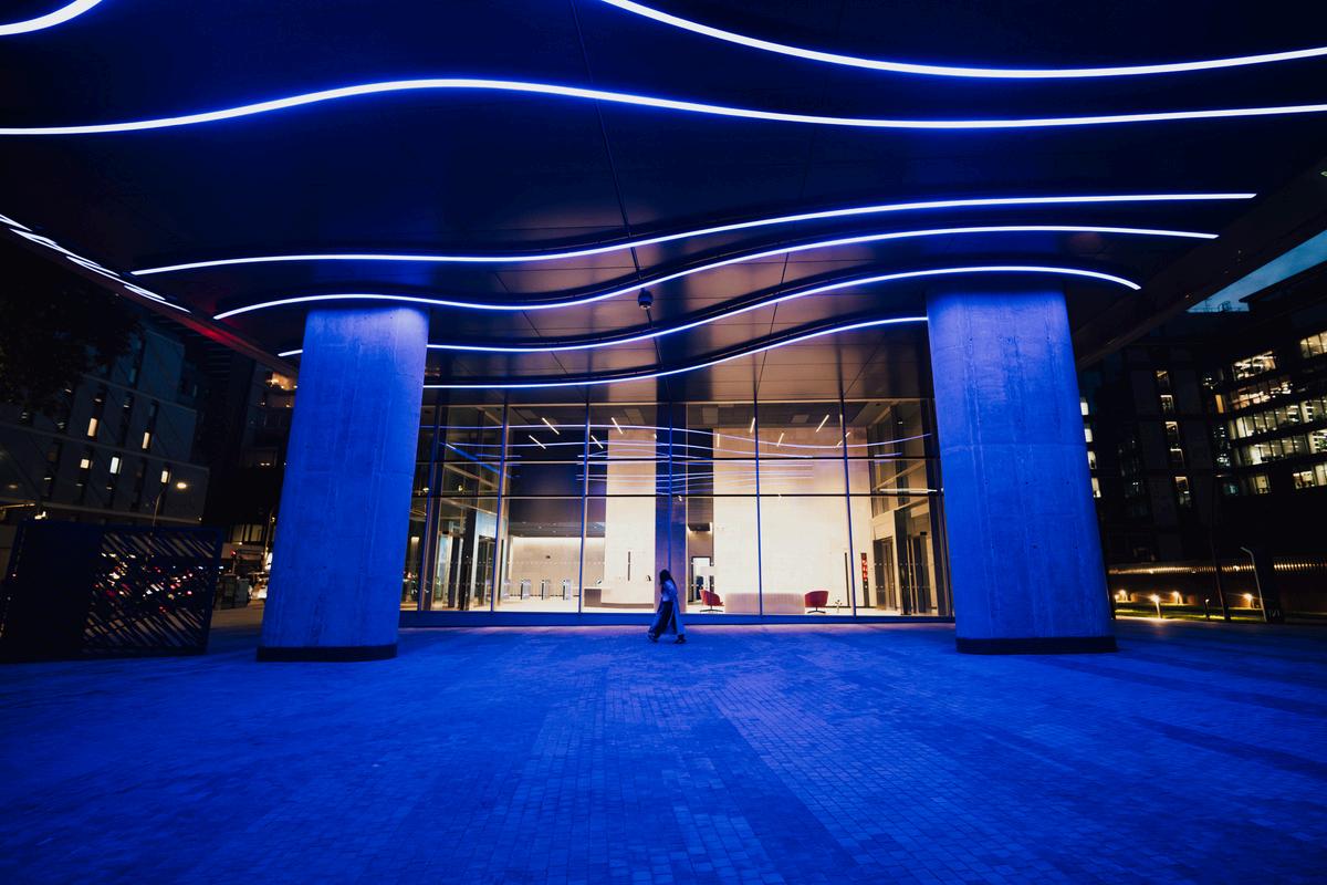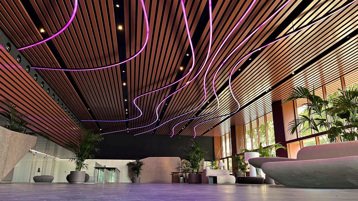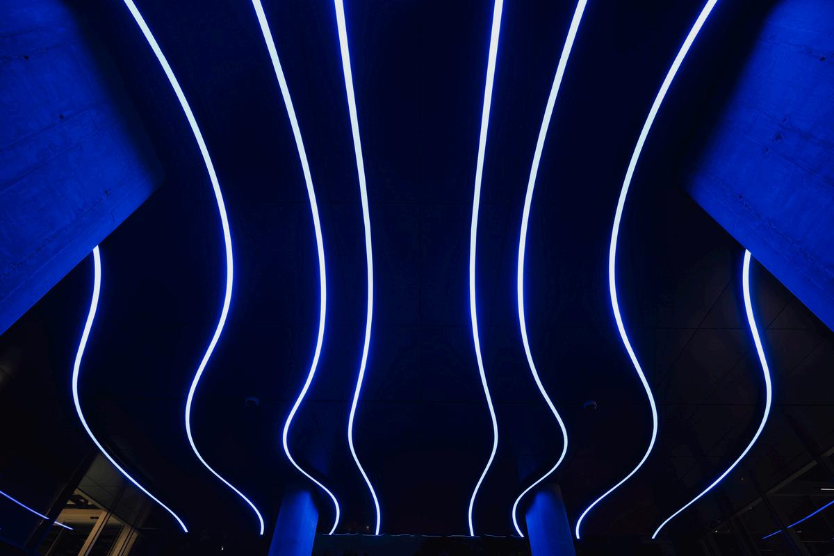 Estas formas sinuosas evocan el movimiento del aire y de las personas, creando una sensación de fluidez y continuidad entre el exterior e el interior. El juego de líneas luminosas configura una atmósfera envolvente y precisa, capaz de transformar la percepción del espacio a lo largo del día. Las luminarias, de alta potencia y control RGBW, suman un total de 170 metros cuadrados de iluminación digital