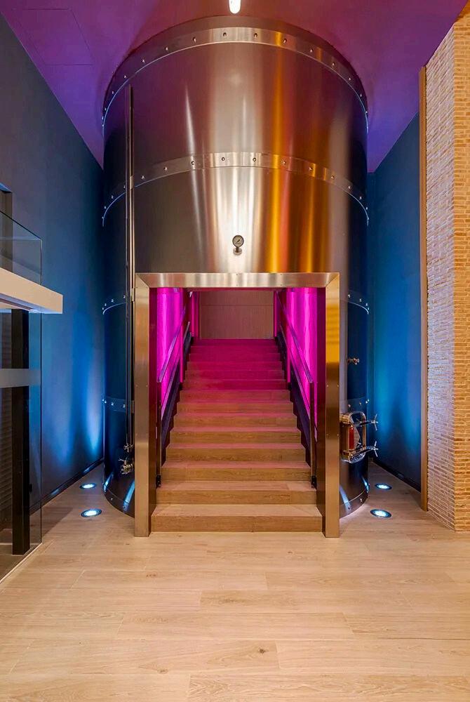 Uno de los elementos más destacados e icónicos del nuevo Gran Reserva es la Cuba Digital, una estructura cilíndrica de 20m² que convierte la tradicional barrica en un recorrido sensorial. Este bidón de acero es la encargada de dar la bienvenida antes de acceder a la segunda planta, haciendo sentir al visitante que entra directamente en una bodega real.