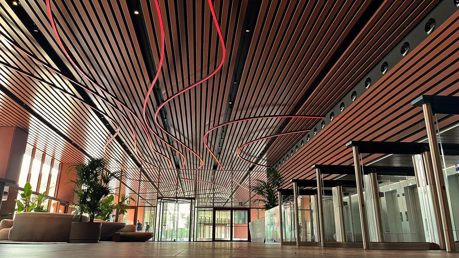 La escultura lumínica, visible tanto desde dentro como desde el exterior del edificio gracias al nuevo muro cortina, está formada por 150 luminarias del modelo Vlit en versión WWA, que cuentan con superficie doble de difusión para ocultar el punto de luz. Su alta resolución les permite realizar transiciones de luz suaves y fluidas.