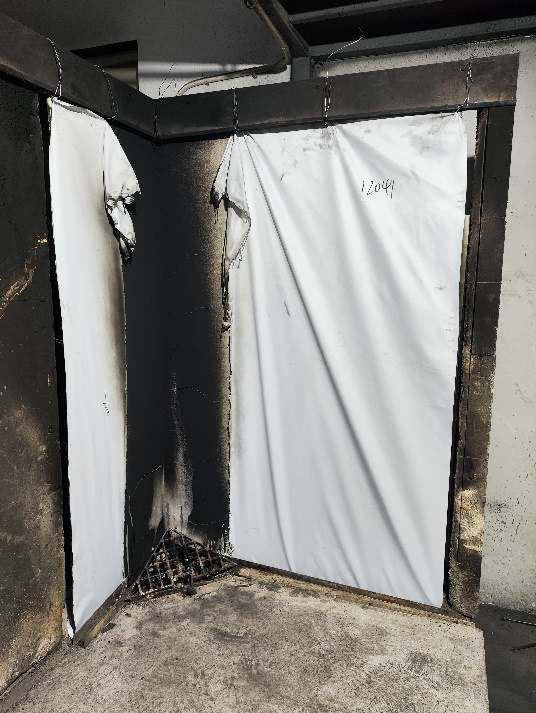 Thetestspecimens arefixedmechanicallyatthetopandthebottom of thetrolleywith adistance of 80mm fromthebackingboard.Thebackingboardwascalciumsilicateboard,withitsdensityapproximate900kg/m3 , thickness approximate9mm,Nojointin the long wing of thespecimens.