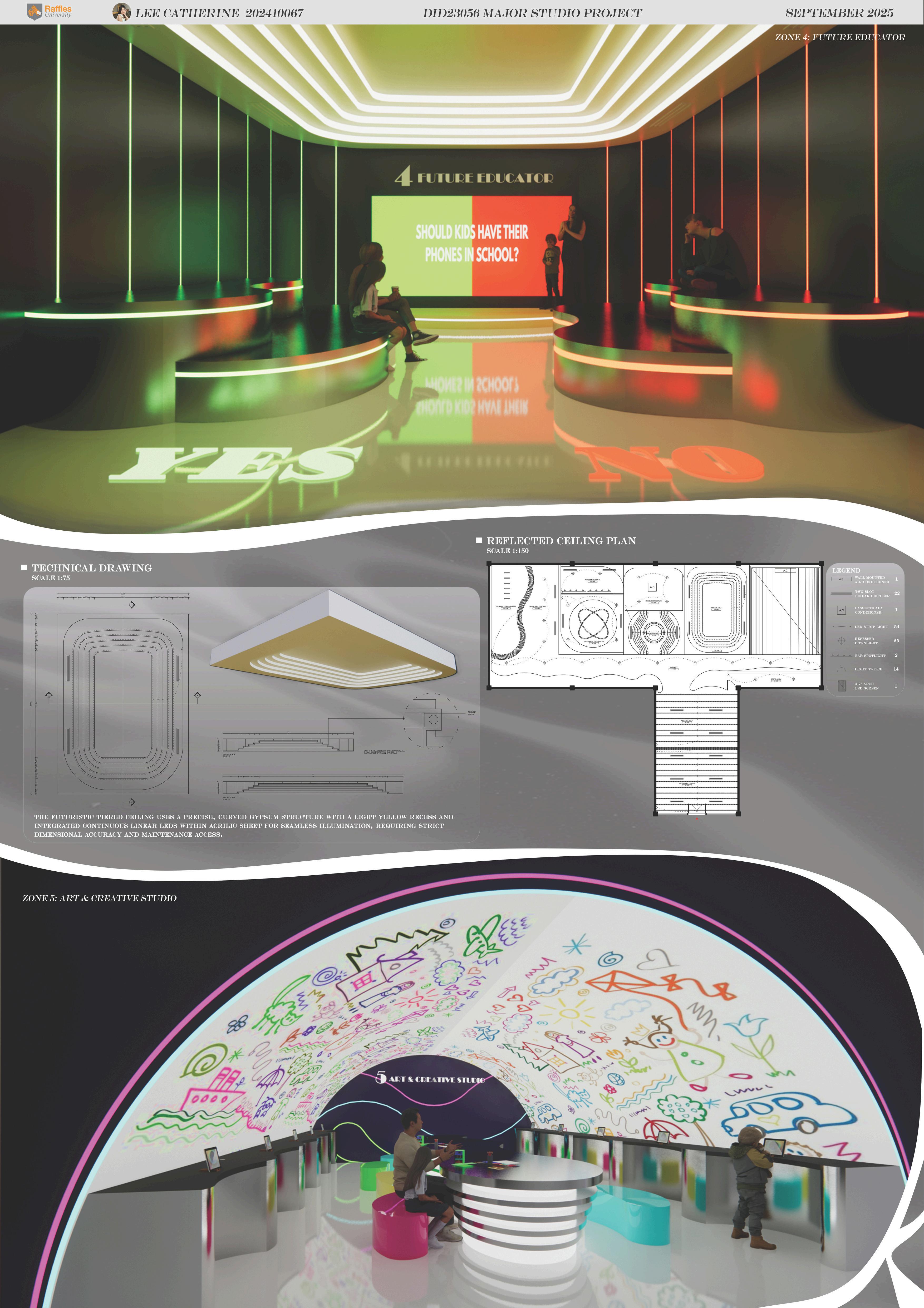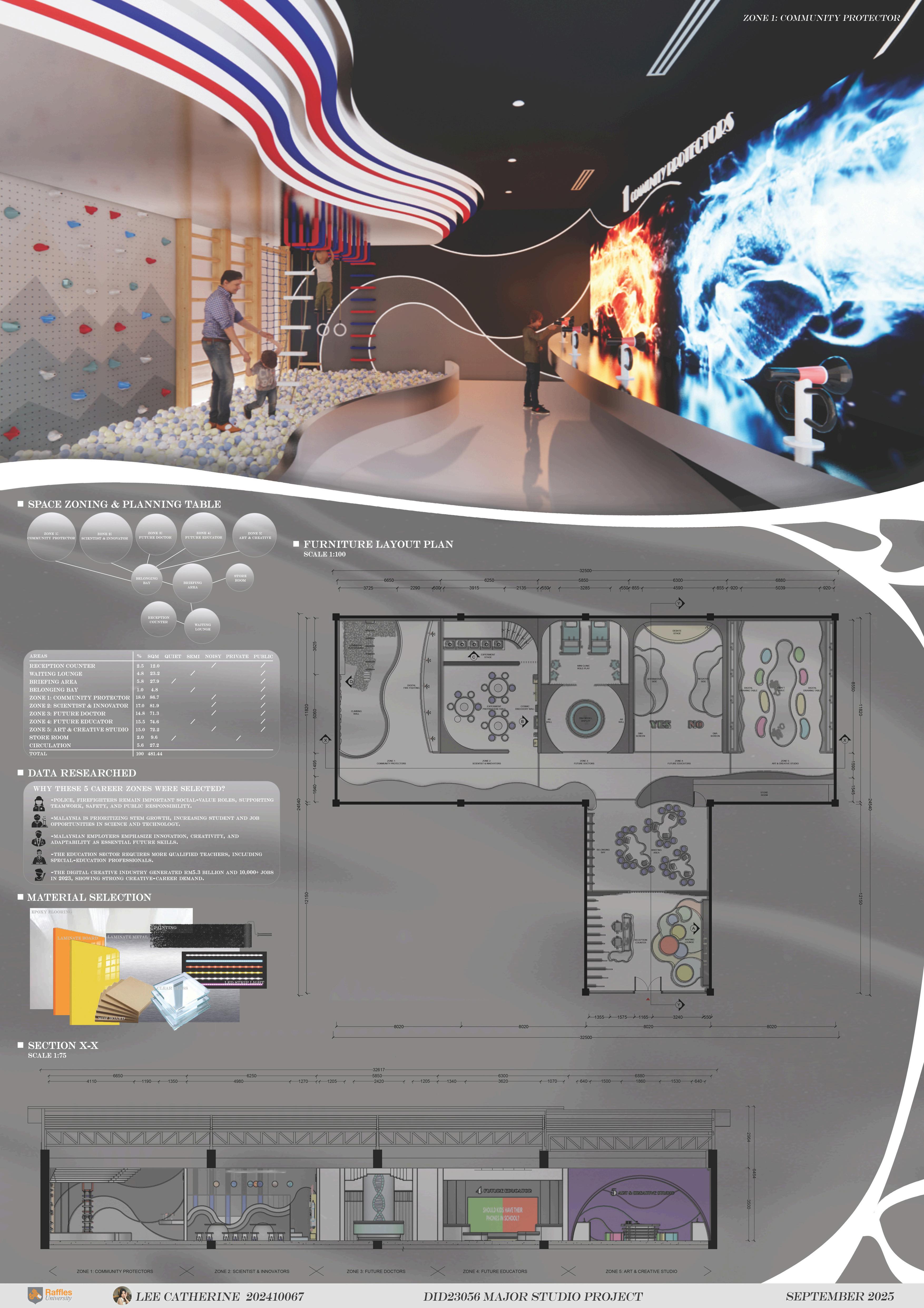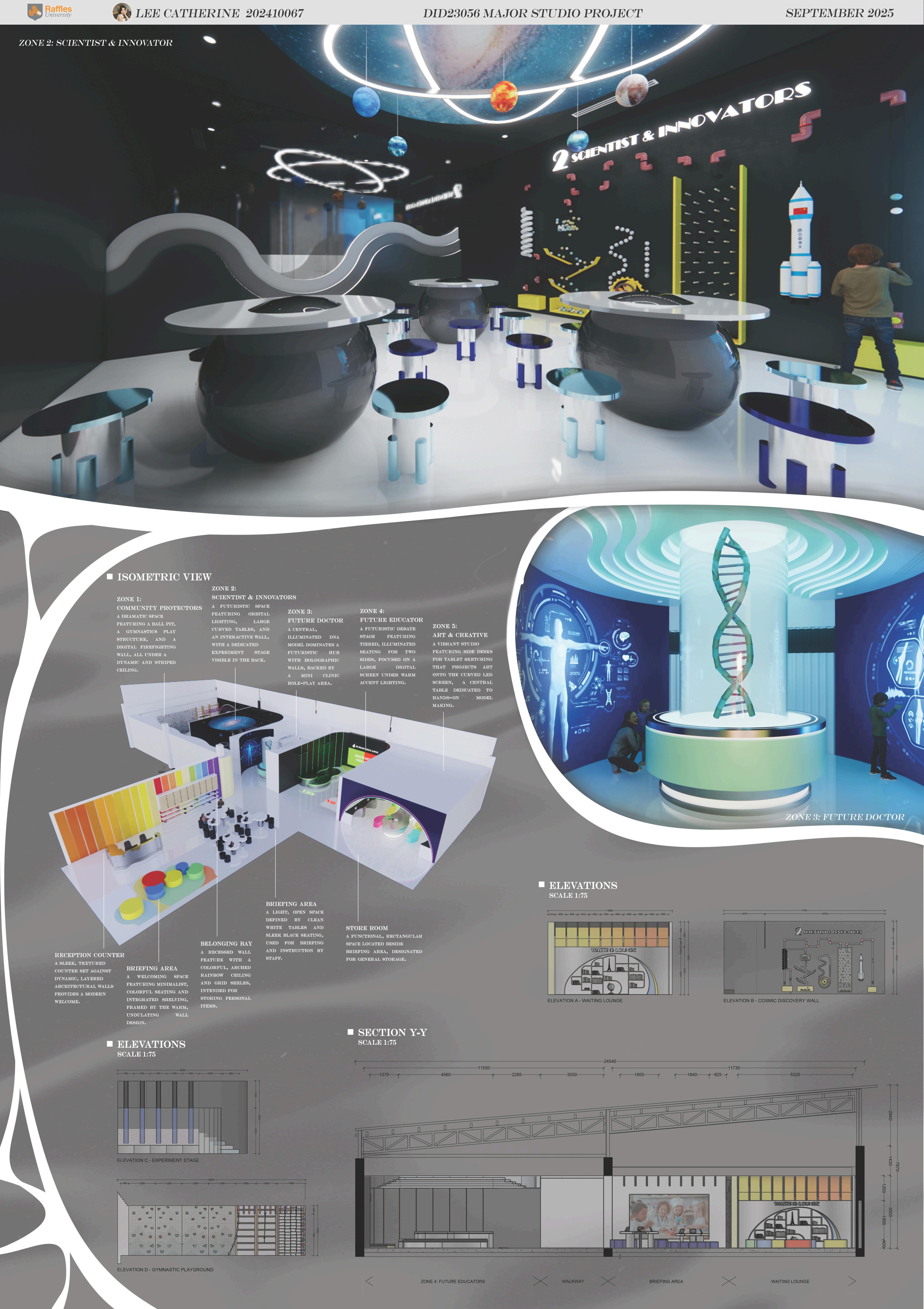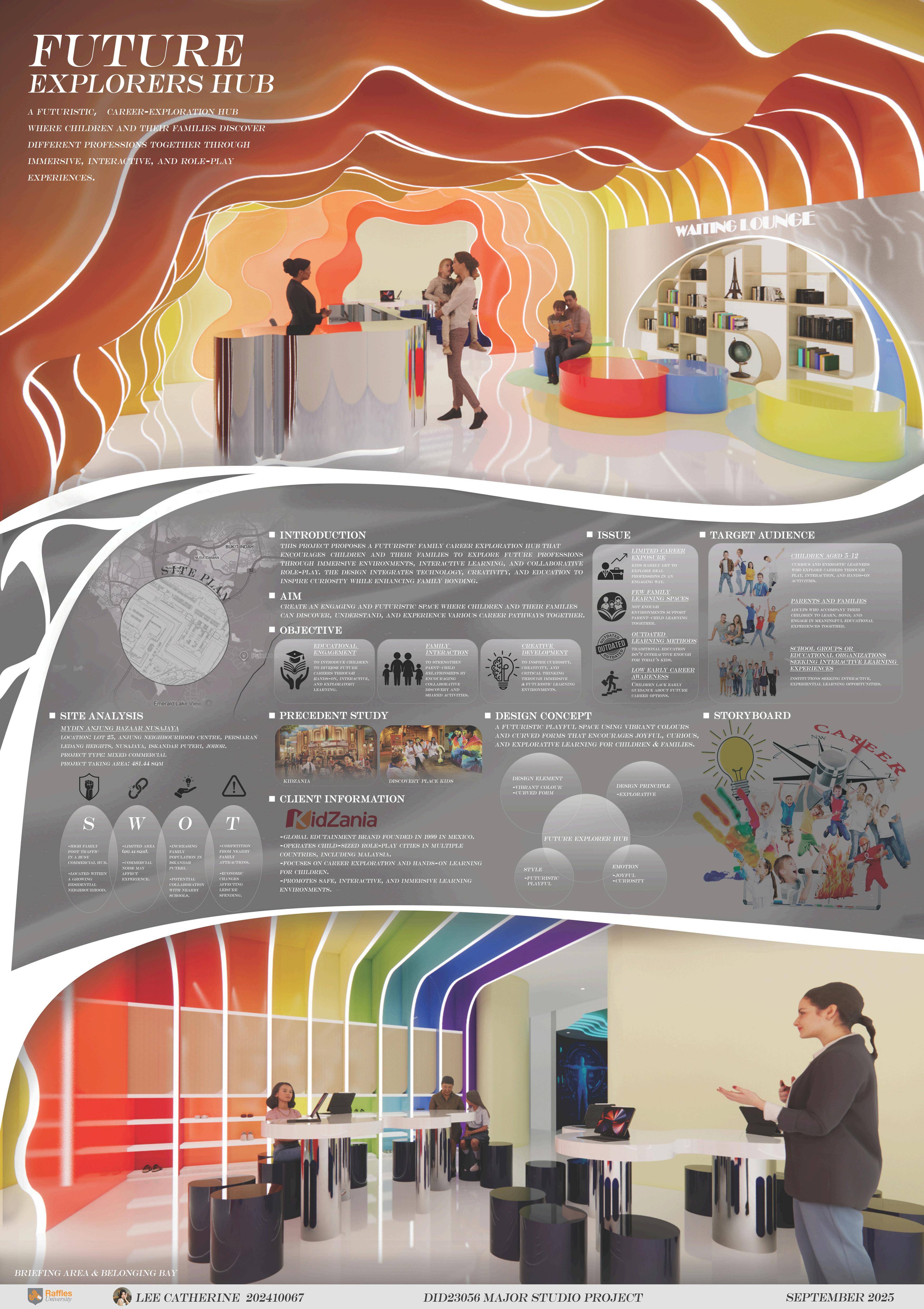 A futuristic, playful learning space where Gen Alpha children and their families explore careers through immersive, tech-enhanced and interactive experiences.The design uses vibrant colours, curved forms, and an explorative approach to spark joy and curiosity. Five key career zones Community Protectors, Scientists, Healthcare, Educators, and Creative Arts, prepare children with future-ready skills aligned with Malaysia’s workforce trends.