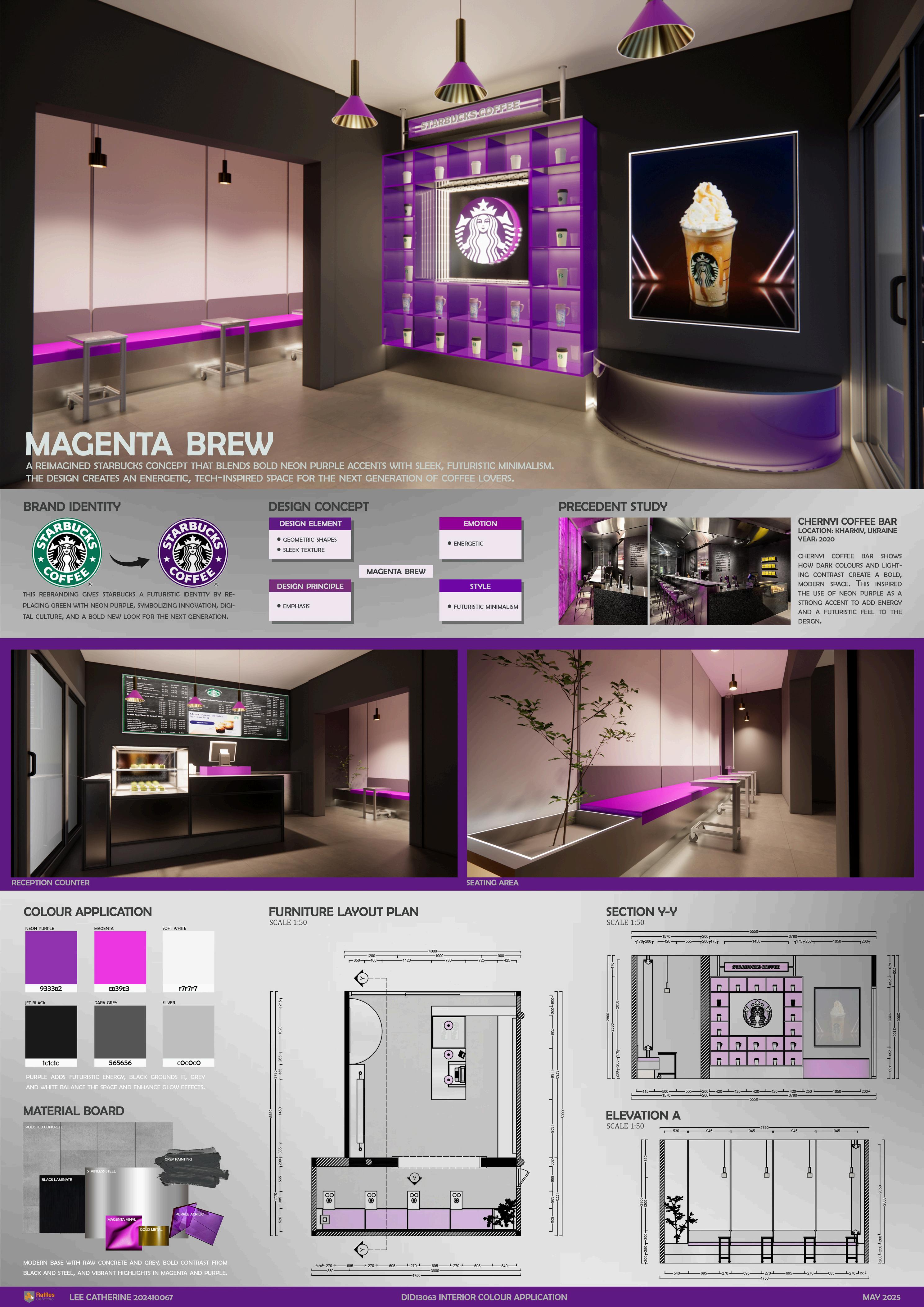This project is for the Interior Colour Application module, focuses on rebranding Starbucks through a strategic colour change. By shifting the signature green to a bold purple, the design redefines the brand’s visual identity while maintaining its core recognition The new colour choice aims to evoke creativity, sophistication, and a modern appeal, aligning with the rebranding objective through colour application.