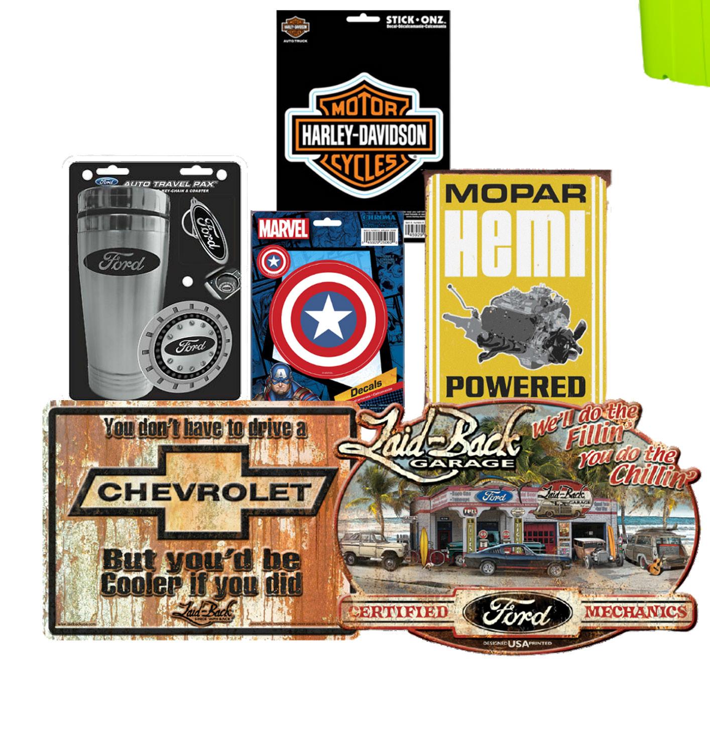 Many items available such as tin signs, car decals, mugs and garage décor.