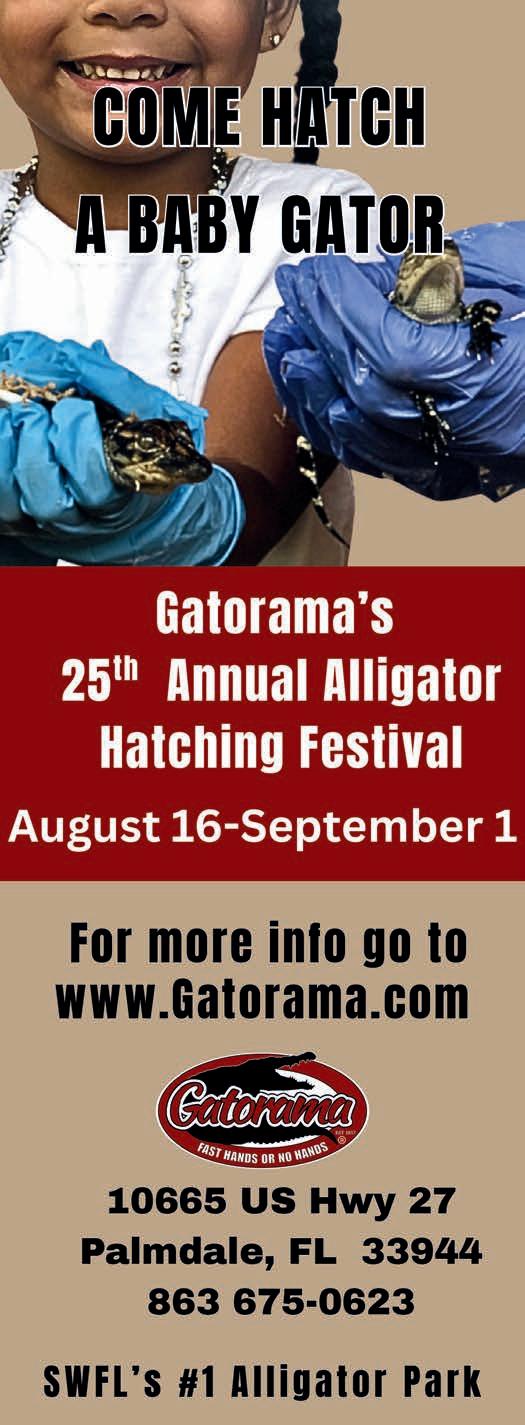 Gatoramaishostingits25thannual AlligatorHatchingFestivalAug.16 throughSept.1attheanimalparkat 10665U.S.Highway27,Palmdale.