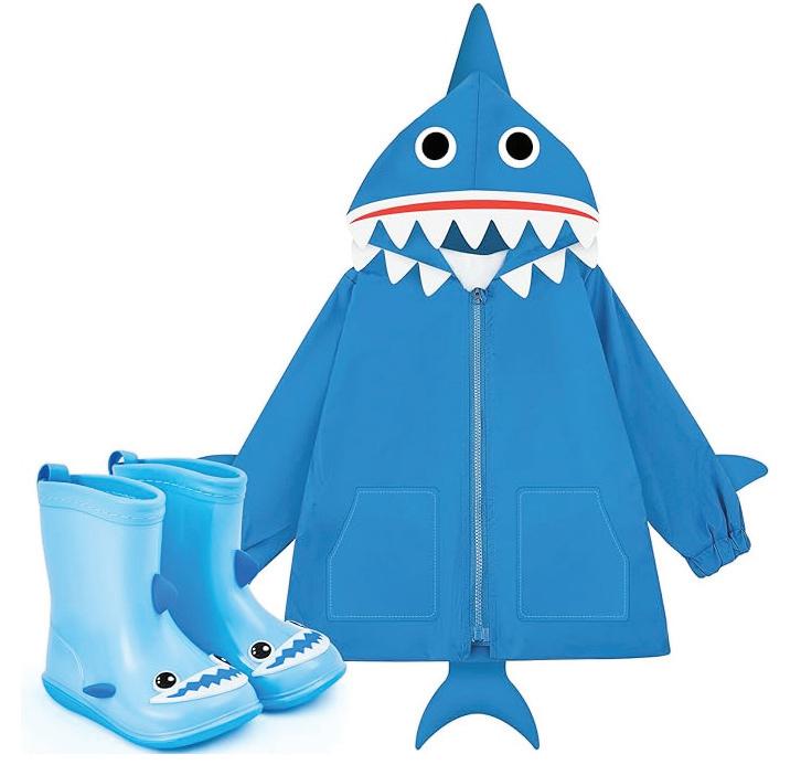 Package includes shark raincoat and blue rain boots providing complete accessories for your child during the rainy day www.amazon.com