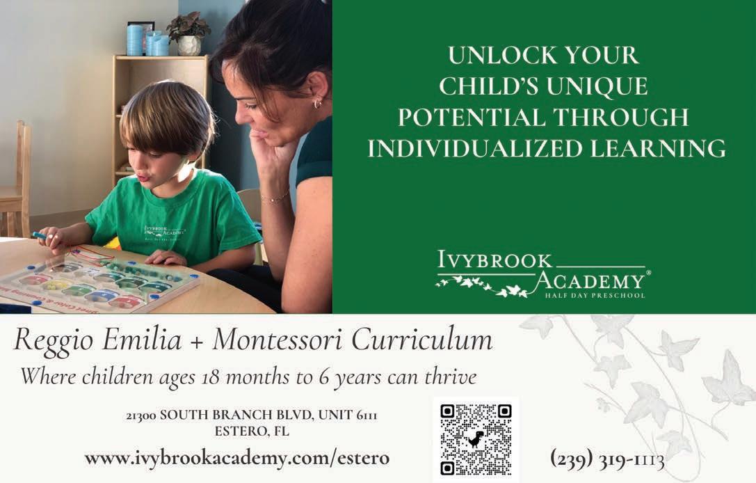 AtIvybrookAcademy,wearecommitted toprovidinganinnovativeandnurturing environmentwherechildrencanthrive. Blendingtheproveneducationalphilosophies ofReggioEmiliaandMontessori,our approachprioritizesindividualizedlearning, social-emotionaldevelopment,andcollaboration,ensuringthateachchildissupportedon theiruniqueeducationaljourney.Webelieve infosteringnotonlyacademicgrowthbut alsocreativity,criticalthinking,andasense ofcommunity.Ourhalf-dayprogramisnow enrollingforthe2025-26schoolyear. 21300SouthBranchBlvd., Ste6111,Estero•239-319-1113 ivybrookacademy.com/estero