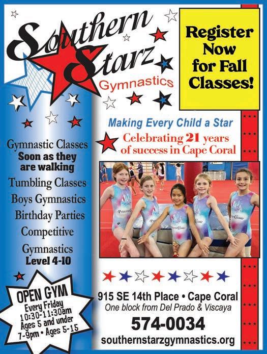 JumpintothenewschoolyearatSouthern StarzGymnastics.OurLittleStarzgymnasticsprogramisgearedtowardgymnasts1-5years.These Starzwillfocusonbeginninggymnasticsskills whilehavingfuninour11,000squarefootfacility.Weoffergymnasticclasses,tumblingclasses, boysgymnasticsandcompetitivegymnastics. 915SE11thPlace,CapeCoral 239-574-0034 southernstarzgymnastics.org