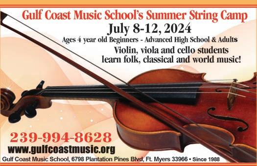 GulfCoastMusicSchooloffersSuzukiandtraditionalprivatelessonsandgroupclassesforviolin,viola,andcello forbeginningthroughadvancedlevel,ages4-104.Since 1988,wehaveofferedyearroundclasses,excitingperformanceopportunities,andafunsummerprogram.This yearourSummerStringCampisJuly8-12,2024.Callus at239-994-8628formoreinfo.