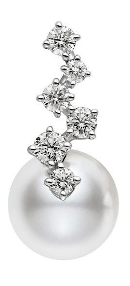 From the Classic Collection, Akoya cultured pearls with diamonds in 18K white gold. Pendant, $5,200; earrings, $5,200; drop earrings, $3,300; ring, $4,700. From the Morning Dew Collection, Akoya cultured pearls with diamonds in 18k white gold. Earrings, $2,300; pendant, $2,400.