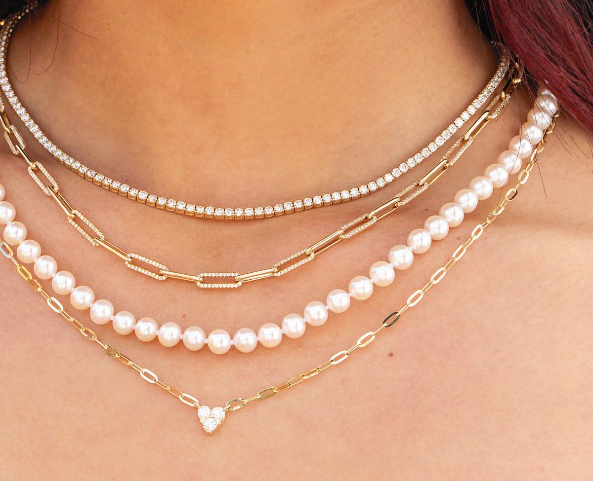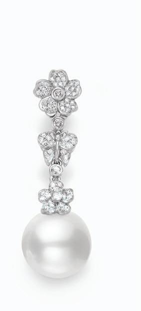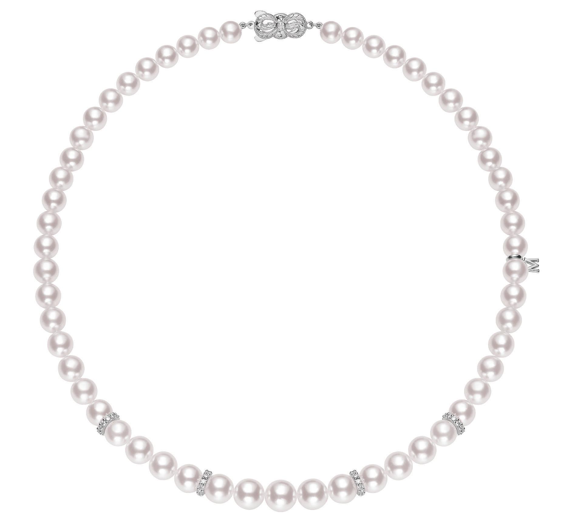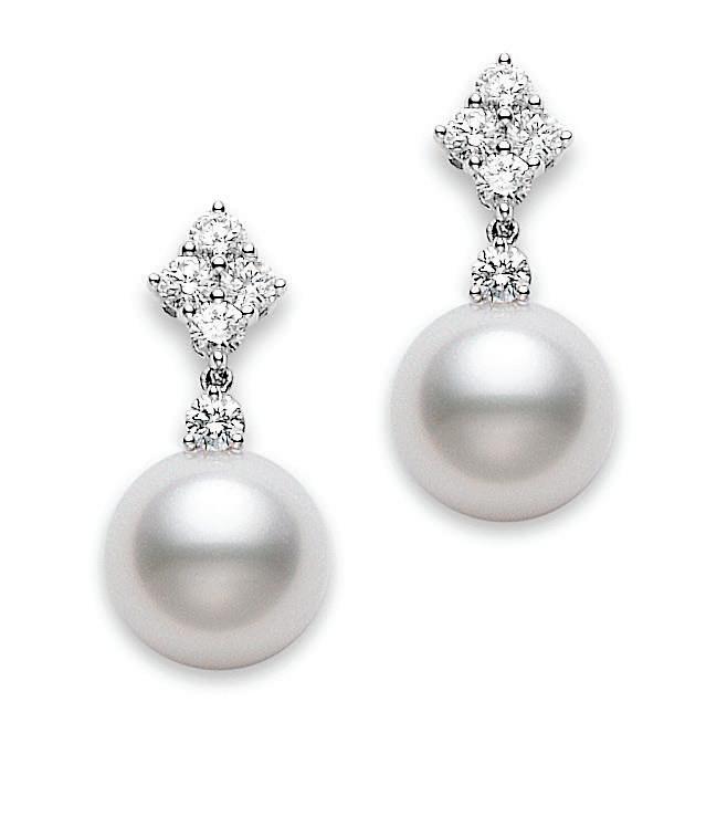 Clockwise from top left: Classic Akoya cultured pearl and diamond pendant, $2,350; Akoya cultured pearl graduated strand necklace with diamond rondelles, $16,000; Classic Elegance White South Sea cultured pearl and diamond pendant, $11,000; Classic Akoya cultured pearl and diamond earrings, $7,800; Cherry Blossom White South Sea cultured pearl and diamond earrings, $18,000; Classic Elegance White South Sea cultured pearl and diamond earrings, $14,000. All set in 18K white gold.