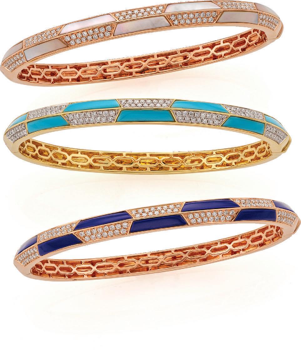 Clockwise from top left Cialoma small diamond flower necklace, $2,800. Cialoma small diamond flower ring, $2,900. Princess flower sapphire, diamond and tsavorite ombré flower necklace, 33”, $9,800. Navarra diamond link bangle, $8,300. Venetian Princess diamond floral bangle, $6,100. Love in Verona diamond pavé bangle, $14,700.