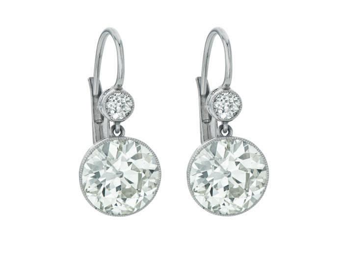 6.25ctw diamond drop earrings, antique reproduction in platinum, $72,000. Pearl and diamond garland design necklace in 18K white gold, $6,900.