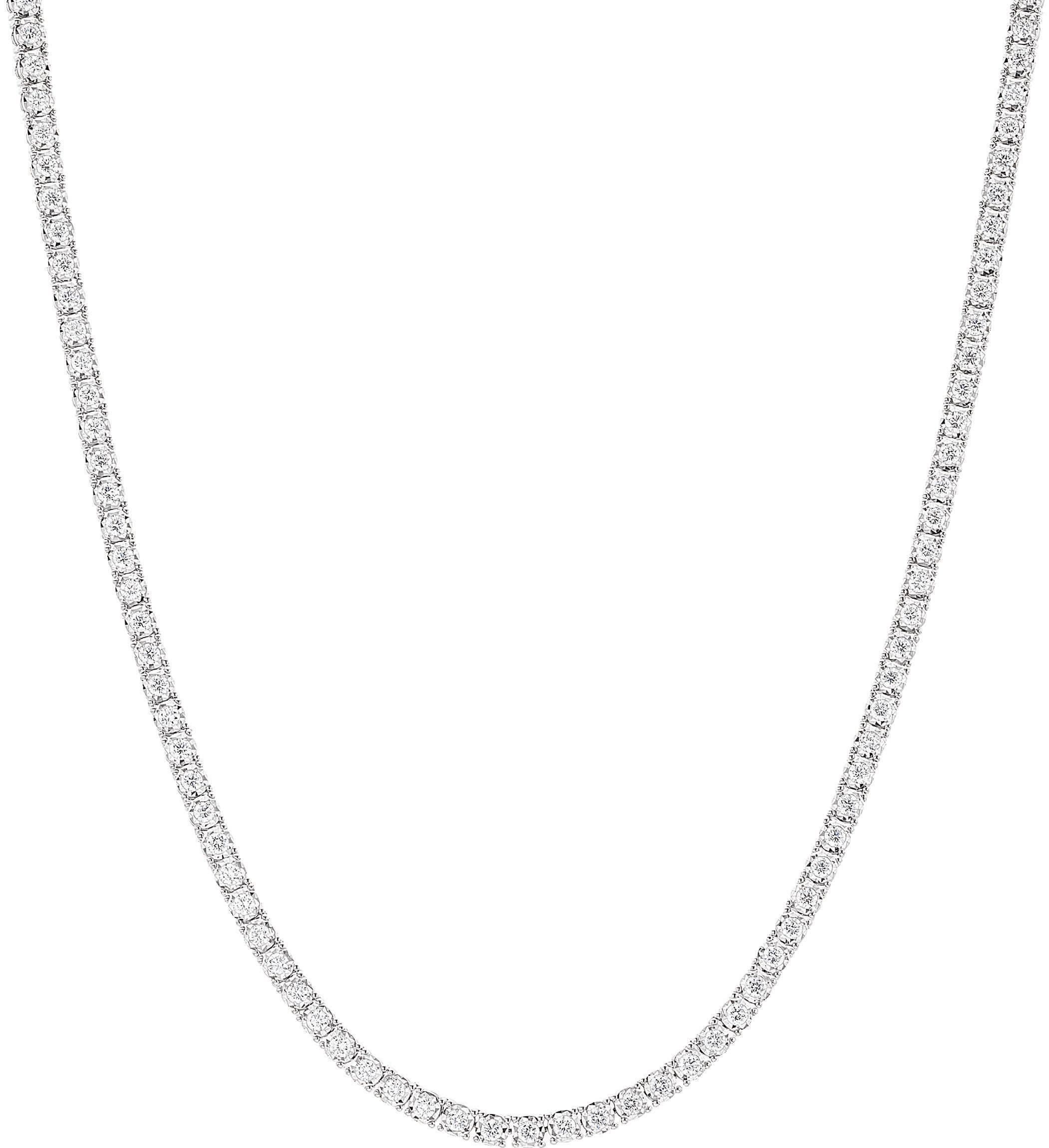Model is wearing a 3.79 Emerald cut platinum diamond engagement ring with emerald diamonds at each side surrounded by a diamond halo, $95,000. Five-row round diamond line bracelet, 15ctw, $23,500. 37.55ctw flexible “v” shaped links diamond necklace, $95,000. 5ctw diamond all around necklace, $12,650. 16ctw oval diamond all around necklace, $59,500.