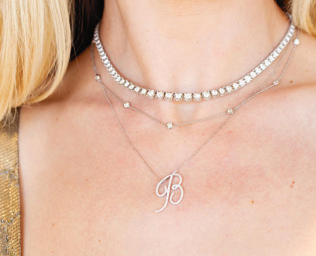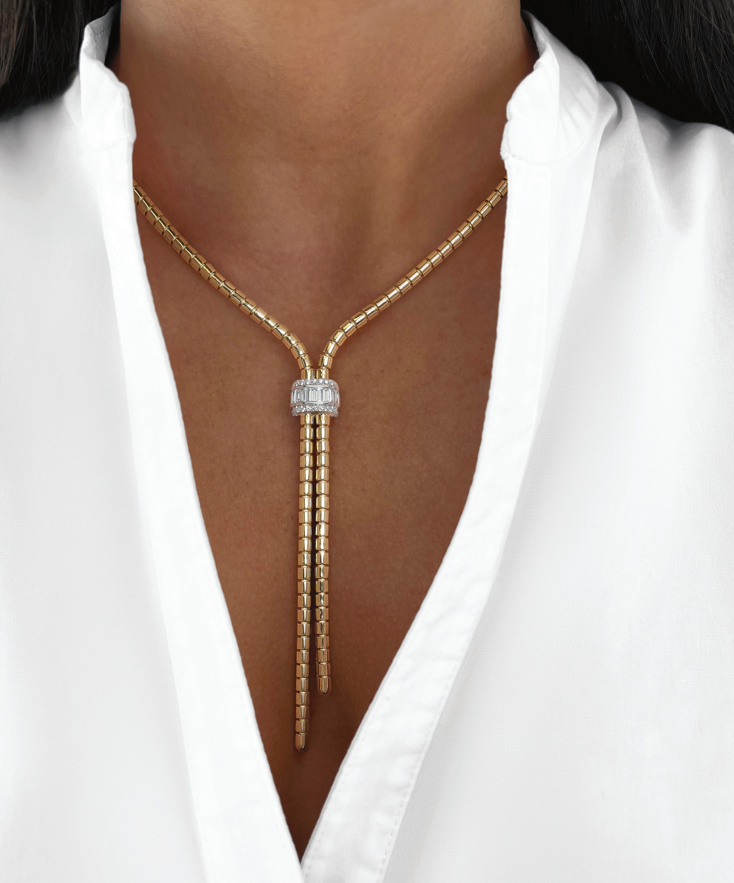Model is wearing Penny Preville emerald cut diamond illusion pendant on paperclip chain, $6,480. 37.99ctw, 45” round diamond by the yard necklace, $67,500. Diamond bezel set bracelets from $3,975$11,500. Bezel set diamond band, $1,850. Octagon shape bezel set diamond ring, $5,500.