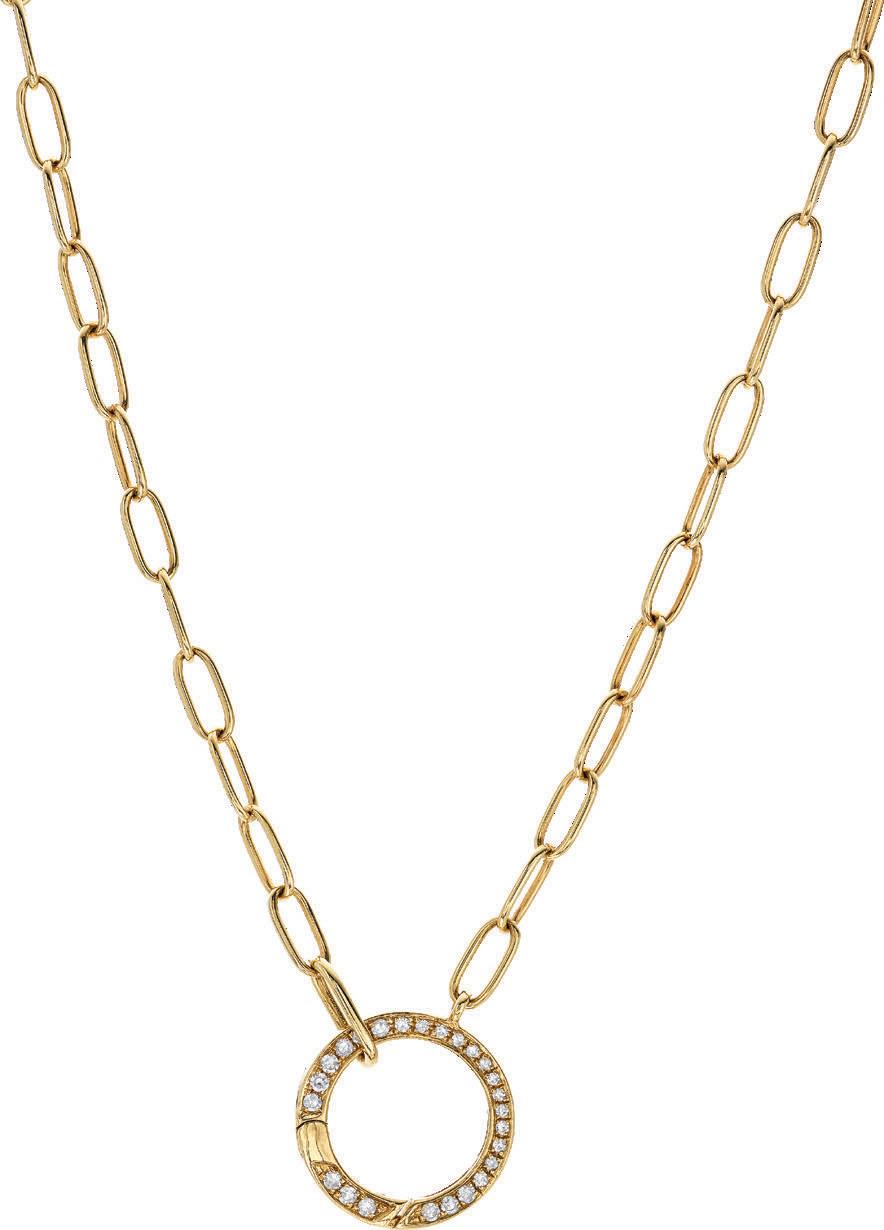 Model is wearing gold and diamond link necklace, 1.36ctw, $4,500. Cuban link pavé diamond necklace, 9.0ctw, $14,000. 5ctw diamond line necklace, $12,650. 2ctw oval shape solitaire diamond ring, $31,875. Gold and diamond link ring, $1,500.