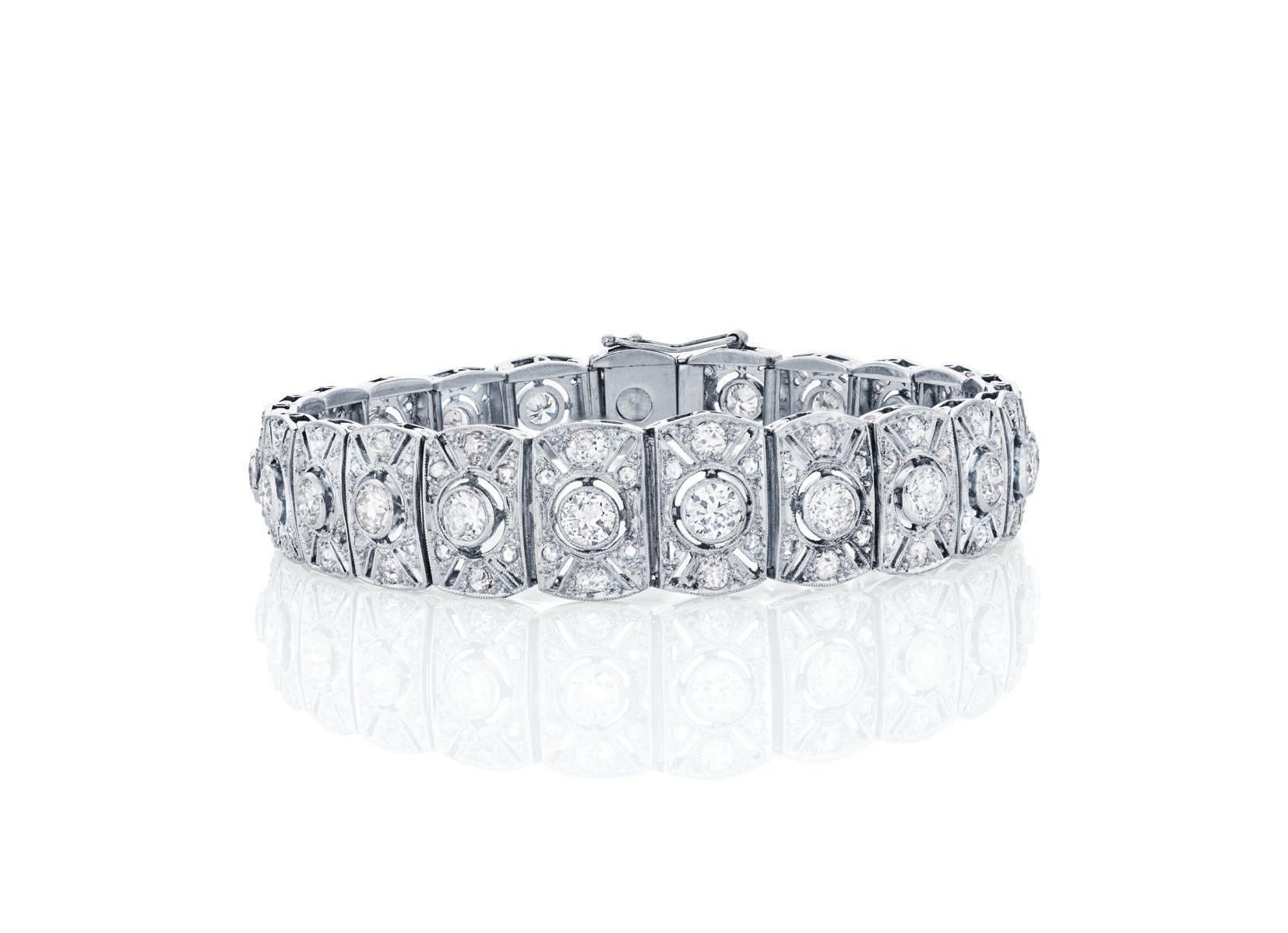 Edwardian dangle bow pin, $10,695. Platinum diamond antique bracelet, $24,525.