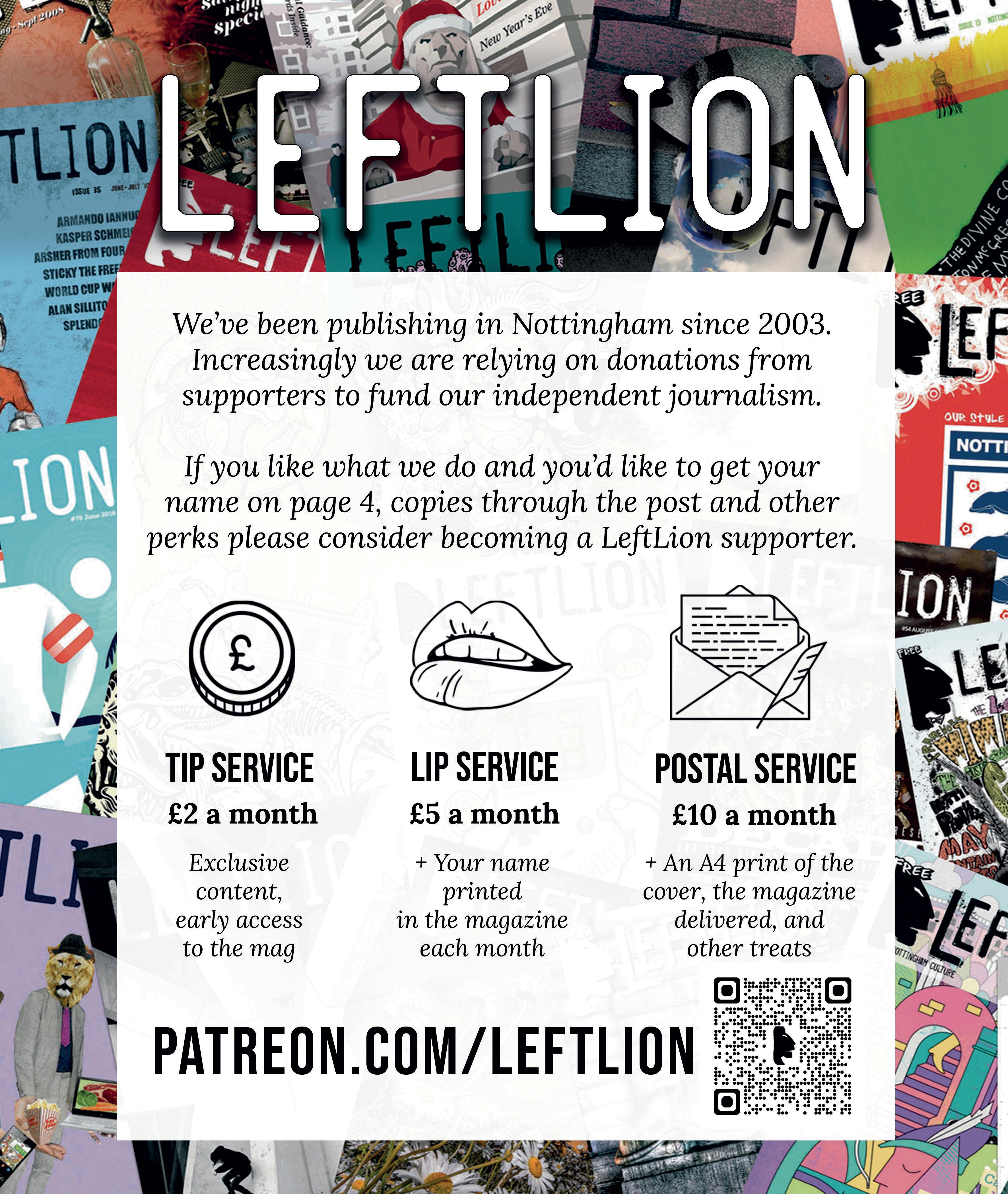 name (or the name of your band, small business, loved one, pet etc) in this mag every month? It only costs a fiver and the money supports this magazine. Plus you get all kinds of other treats too. patreon.com/leftlion