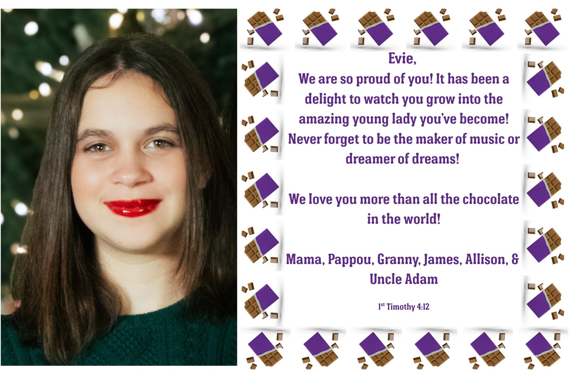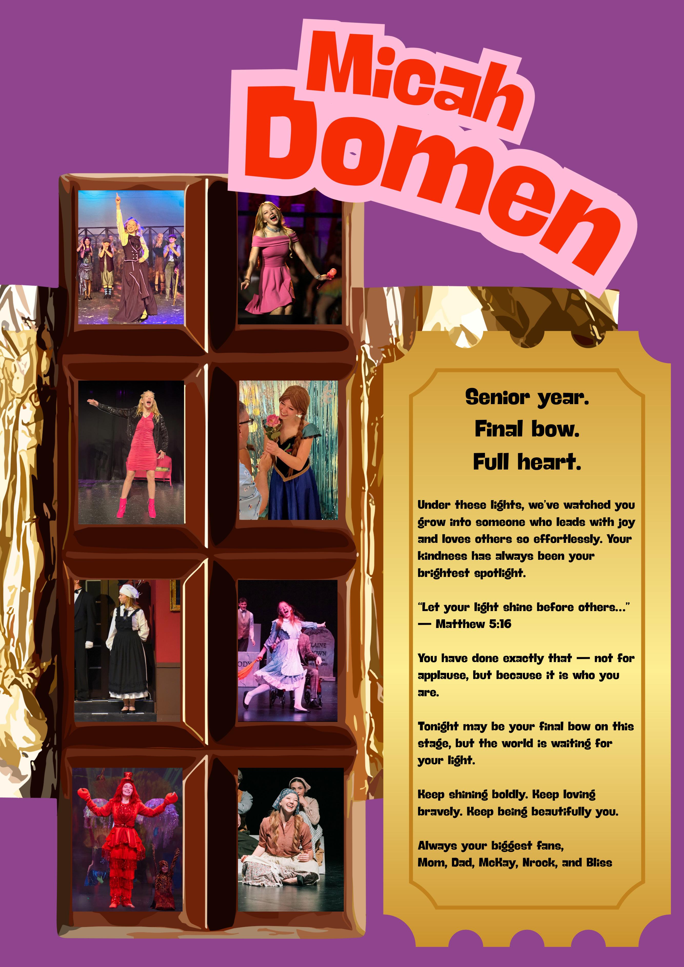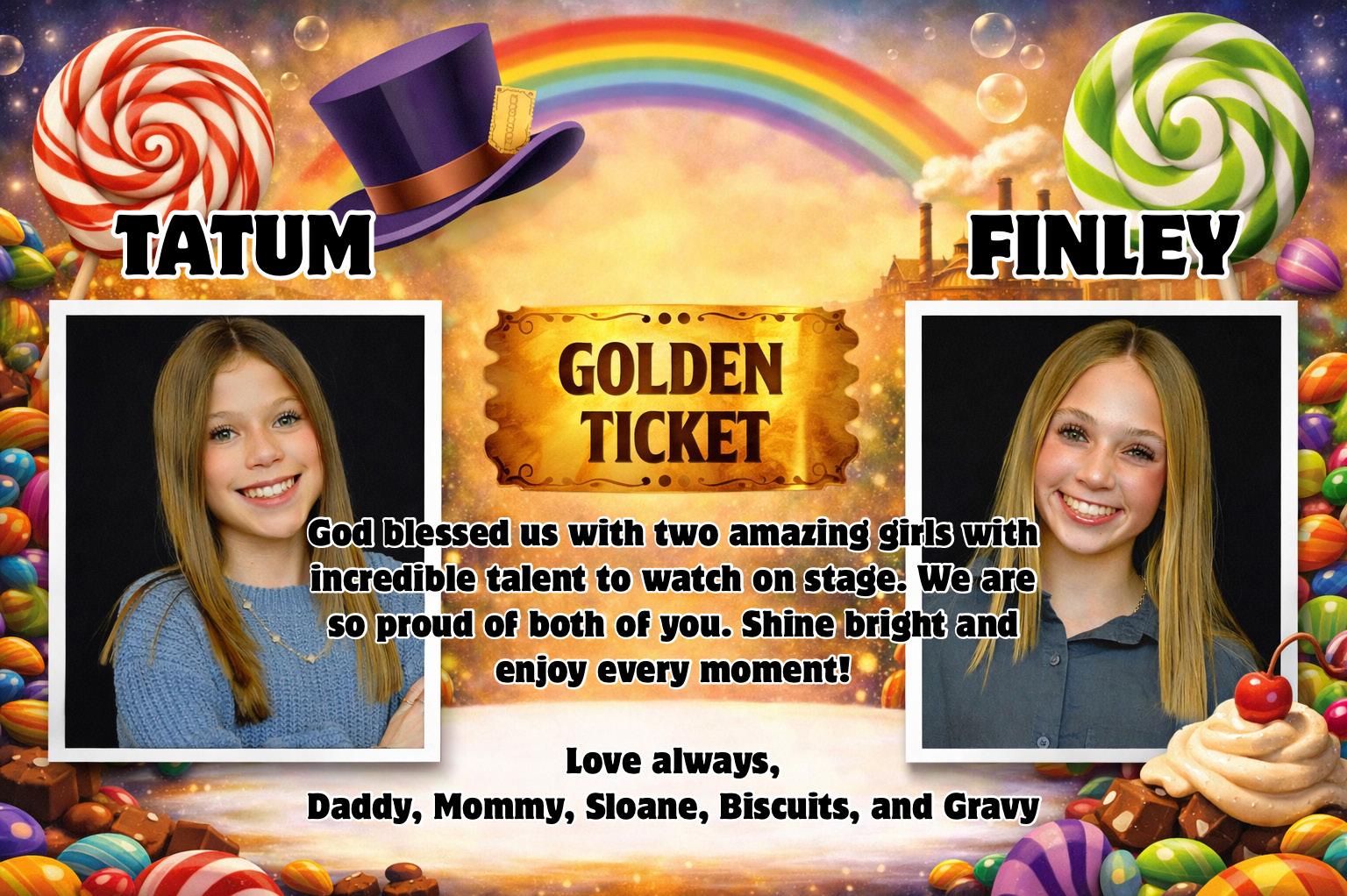 In a world full of golden tickets, you are one of a kind. We are so proud of the hard work, courage, and joy you bring to everything you do—especially on this stage. Watching you shine has been the sweetest reward. Break a leg and enjoy every magical moment of Charlie and the Chocolate Factory!