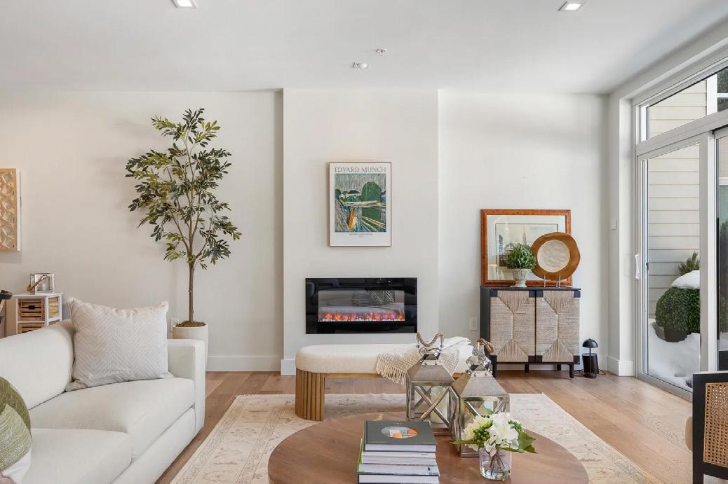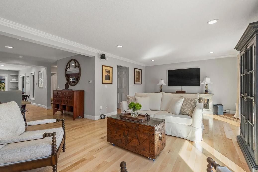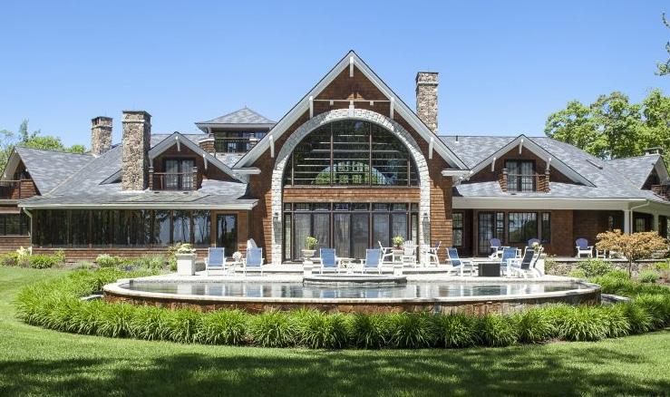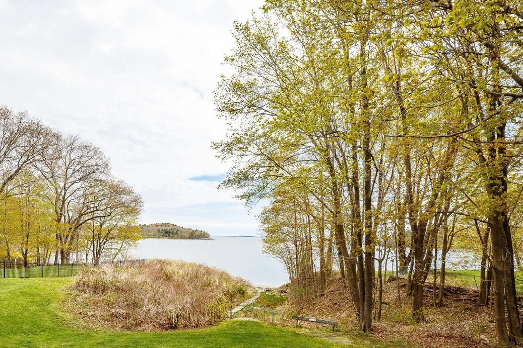 The great room overlooks Brickyard Cove and features comfortable seating around the fireplace, a large dining area for gatherings, and a fully equipped open kitchen with island seating. Outdoors, enjoy a spacious deck with grill, griddle, and pizza oven. The grounds offer a true coastal retreat with shoreline access, pebble beach, dock, gardens, and a heated pool for relaxing and entertaining.