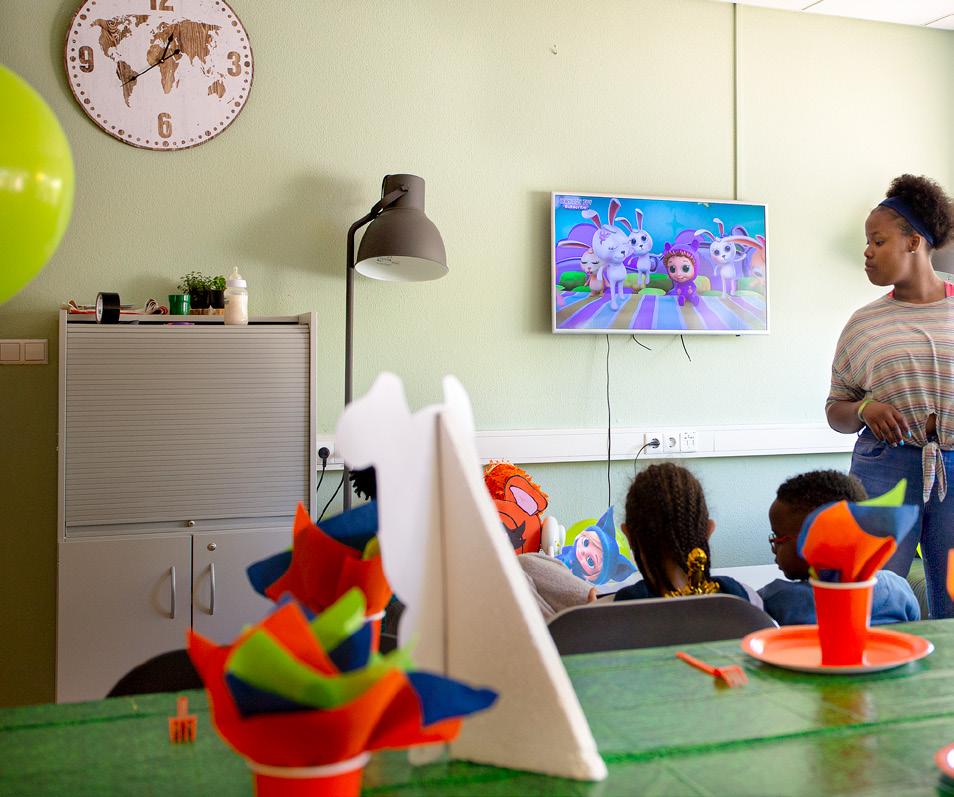 In de zithoek met bankstellen kijken de bewoners Netflix. Stapels tweedehands rompertjes liggen op tafel. ‘Die mogen mensen uitzoeken voor hun baby’, vertelt Neli. Kleuters rennen door de gang, op weg naar het klimrek in de tuin. Een jongetje begint te huilen, maar Neli weet wat ze moet doen om hem te kalmeren. Een aai over zijn bol en hij rent weer vrolijk weg.