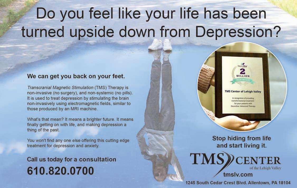 Thousands in the Lehigh Valley struggle with depression every day, but thanks to the TMS Center of the Lehigh Valley, they are not alone in their fight. We are the region’s first transcranial magnetic stimulation (TMS) treatment facility and one of the most experienced centers on the east coast, having performed over ten thousand TMS treatments. See ads, pages 2.