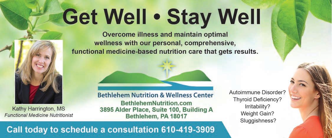 Bethlehem Nutrition & Wellness Center, we give you the tools to bring you and your family into a state of optimal health. Using the most advanced nutritional testing available, we look for the underlying cause of your health problems. Once the underlying cause is addressed not only do symptoms go away, but your overall health can also be greatly improved. See ad, page 10.
