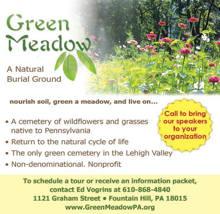 The only green cemetery in the Lehigh Valley. A cemetery of wildflowers and grasses native to Pennsylvania. Return to the natural cycle of life to nourish the soil, green the meadow and live on. Nondenominational. Non-profit. Speakers available to visit organizations. See ad, page 17.
