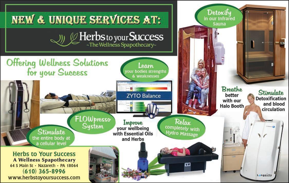 Herbs to Your Success is a health & wellness spa located in Nazareth, offering multiple holistic spa experiences and herbal remedies. We also offer a wide selection of essential oils, teas, skincare, make-up and more! We provide high quality spa services to our customers and our friendly and courteous staff guarantees exceptional customer service. See ad, page 2.