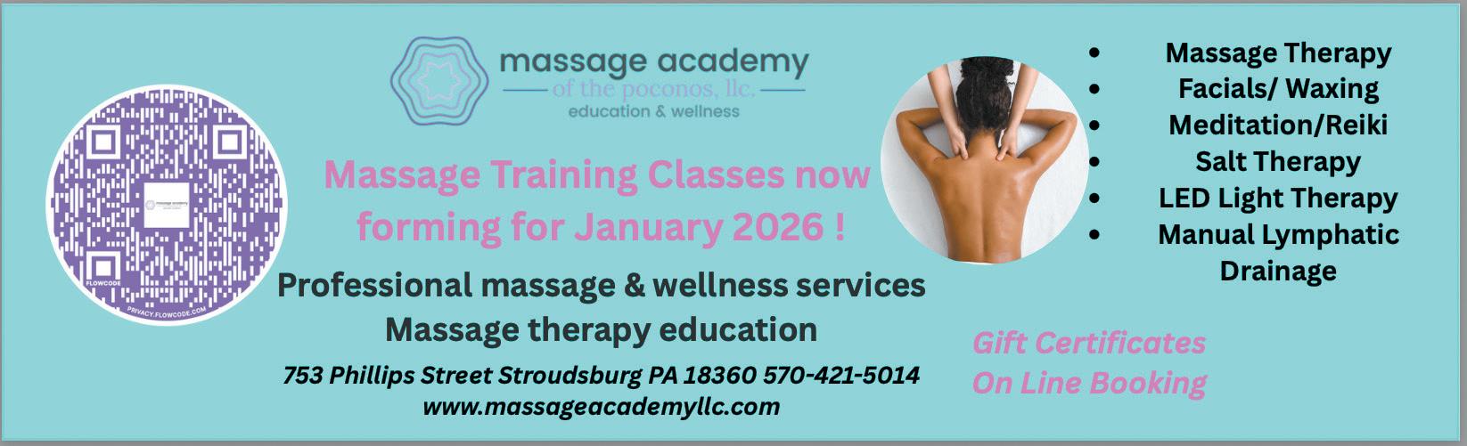 With a comfortable environment, the Massage Academy of the Poconos supports the wellness needs of the local community while preparing the next generation of massage professionals. Its mission blends health, education, and relaxation—providing a place where clients relax and students succeed.