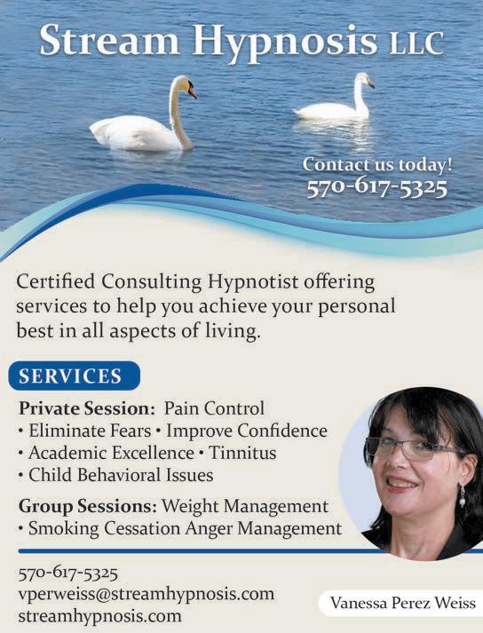 Achieve your personal best in sports, sales public speaking and more. Whether you need to eliminate chronic pain, achieve your ideal body weight, reduce stress, or kick the smoking habit hypnosis is a useful tool that can help you move forward. Individual and group sessions, remote and in person sessions. Board Certified Hypnotist with NGH. See ad, page 7.