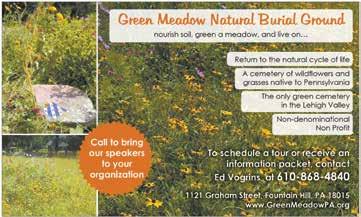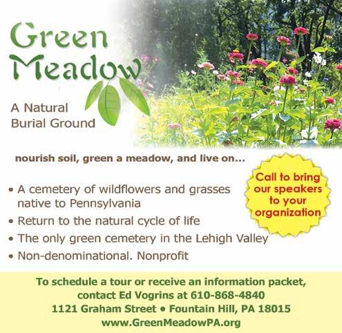 The only green cemetery in the Lehigh Valley. A cemetery of wildflowers and grasses native to Pennsylvania. Return to the natural cycle of life to nourish the soil, green the meadow and live on. Nondenominational. Non-profit. Speakers available to visit organizations. See ad, page 21.