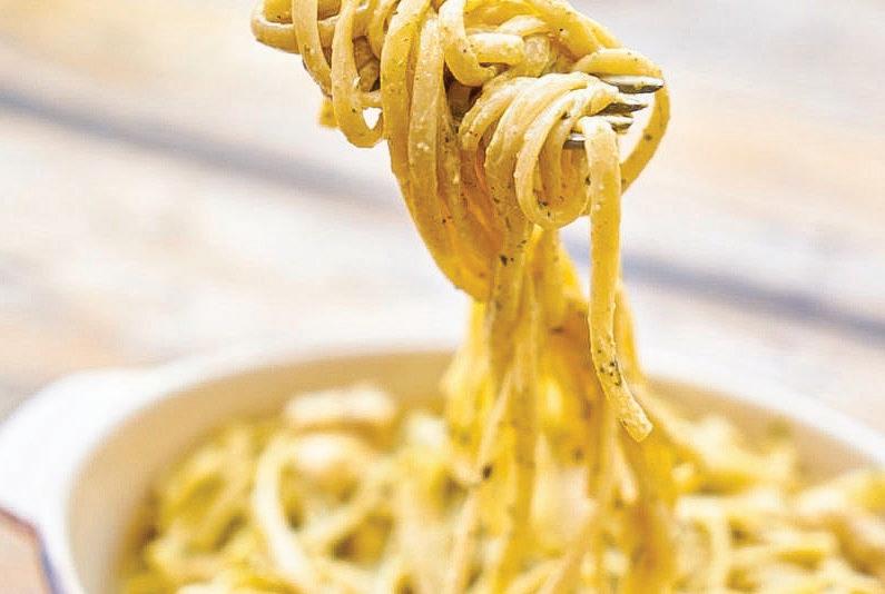 1 pacote de linguine, espaguete ou outra massa de fios longos; 6 colheres (sopa) de manteiga sem sal; 3 colheres (sopa) de missô; 1 xícara (chá) de parmesão ralado; 1 xícara (chá) da água de cozimento do macarrão; Guarnições variadas, como furikake (tempero japonês), alga nori, pimenta calabresa