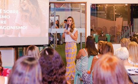 com o prazer e a alegria que merecemos. Com objetivo de colocar em pauta o protagonismo da mulher com potência e alegria em tempos difíceis, a Cultura Inglesa e a BRINQUE trouxeram a Cachoeiro Janine Bastos especialista em Psicoterapia Corporal pelo IABSP, em Filosofia e Psicanálise pela UFES, Gestão de Pessoas