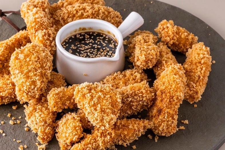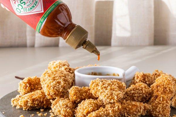 400g de peito de frango sem pele / 1 colher de chá de sal / 2 colheres de sopa de TABASCO® Sriracha / 2 ovos / 1 xícara de chá de farinha panko / 1/2 xícara de chá de farinha de trigo / 2 ramos de tomilho