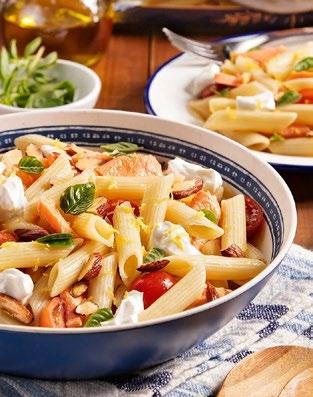 Massa: 1 embalagem de Pena Adria /// Salmão: 500 g de salmão fresco /// Sal e pimenta-do-reino moída a gosto /// Azeite a gosto /// Vinagrete: 150 ml de azeite; 4 colheres (sopa) de suco de limão siciliano; Sal e pimenta a gosto /// Montagem: 300 g de tomate cereja cortado em quatro partes 100 g de amêndoas laminadas torradas e picadas grosseiramente Raspas de 1 limão siciliano 100 g de coalhada seca Folhas de 3 ramos de manjericão
