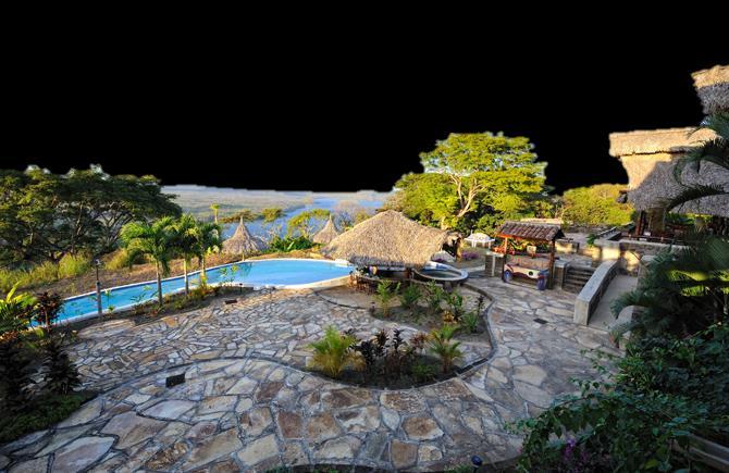Cuenta con los siguientes espacios, posee son una zona pública y privada; zona publica se encuentra un lobby, un bar, área de comensales con vista al volcán Masaya, área de hamacas, mirador con una hermosa vista hacia la laguna y volcán Masaya, y baños públicos; en la zona privada se encuentra la cocina, en ella están 2 cuartos de servicio, lavandería, área de tendederos y el área de almuerzo de los trabajadores Este restaurante cuenta con un área de 180 m2