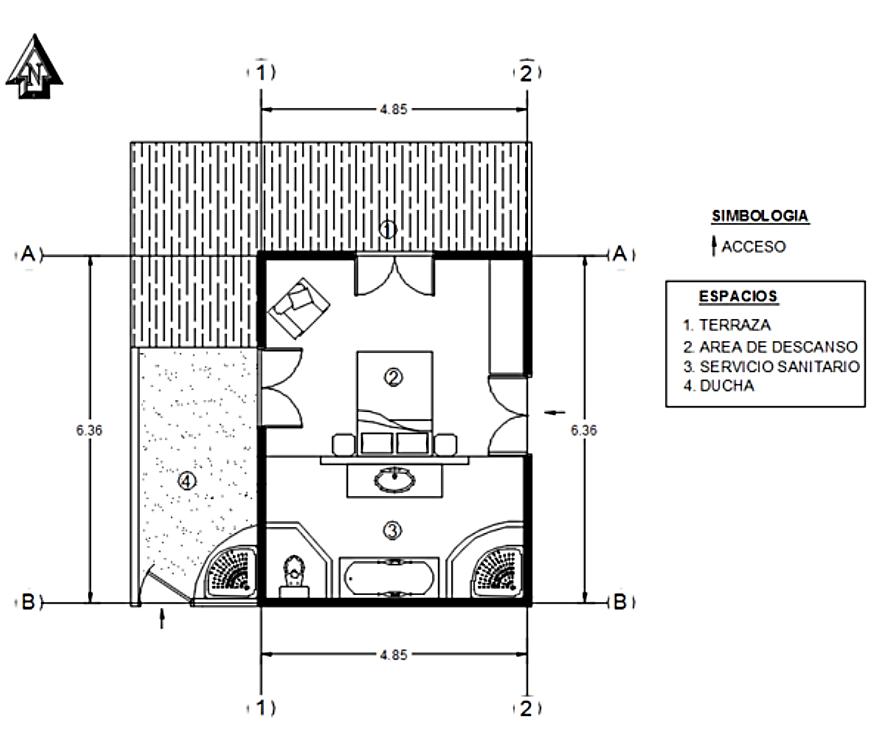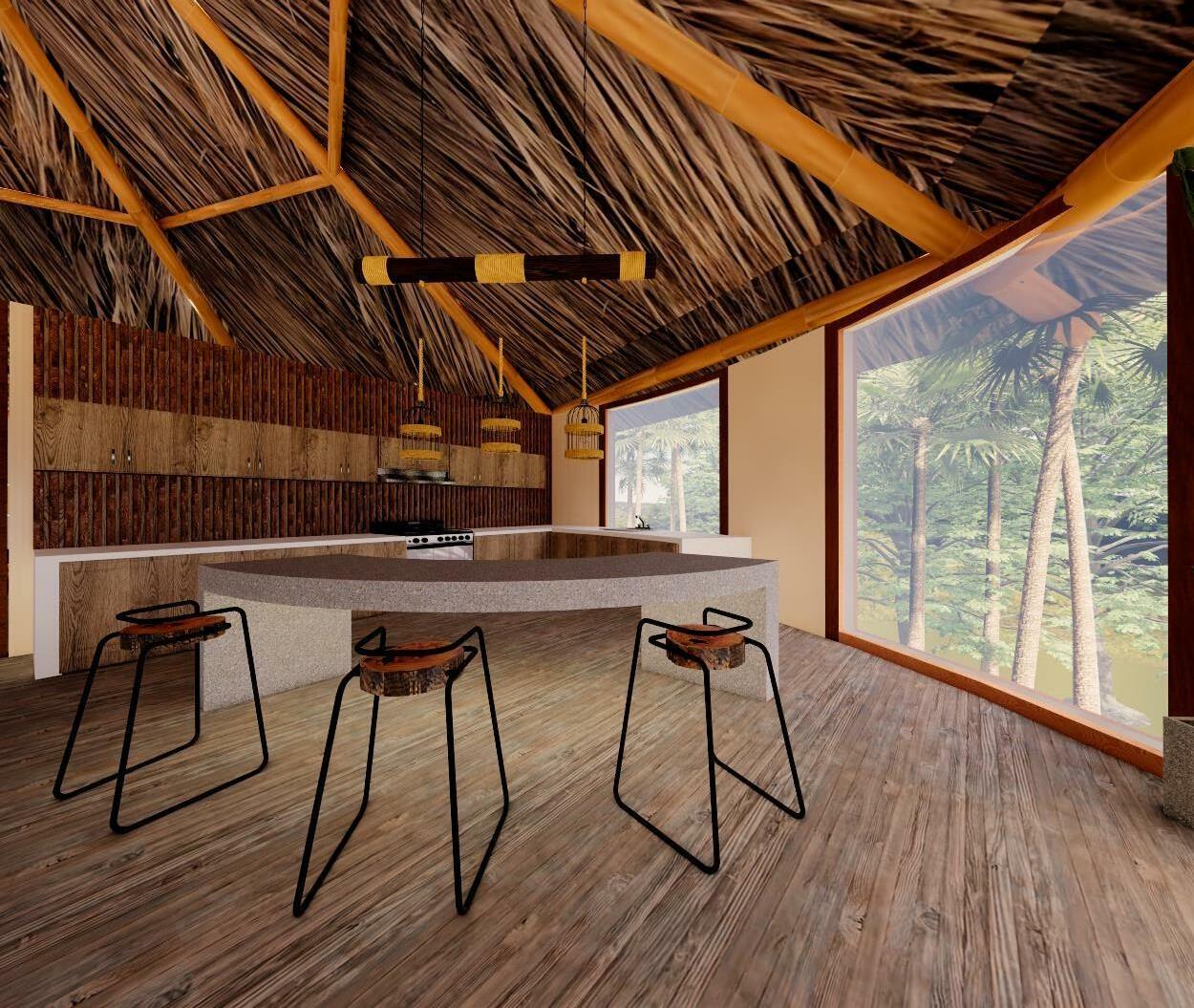 Acabados: Detalles de madera, puertas y ventanas de madera, cielo raso de caña de castilla Paredes de concreto y divisiones de durock