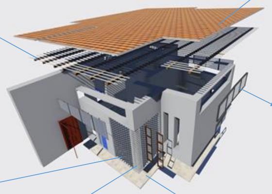 Cerramiento: Mampostería confinada con divisiones en su interior de durock Ladrillo de cerámica rojizo Estructura de techo: De madera Cubierta de techo: Está conformado tejas de barro y cielo falso de caña de castilla