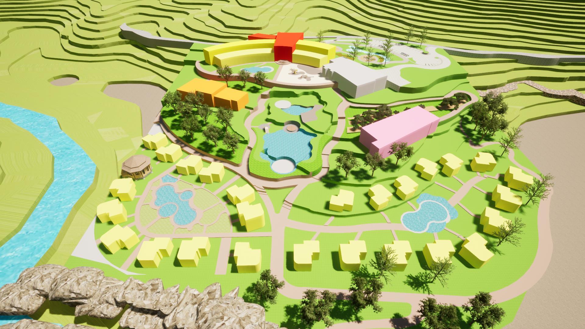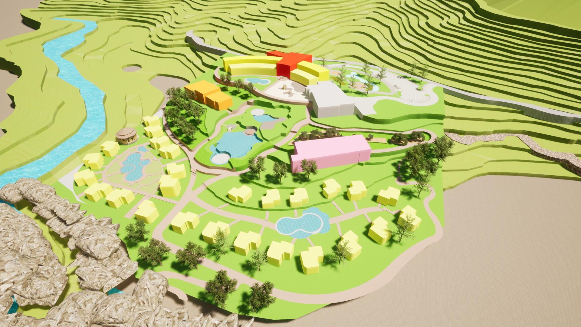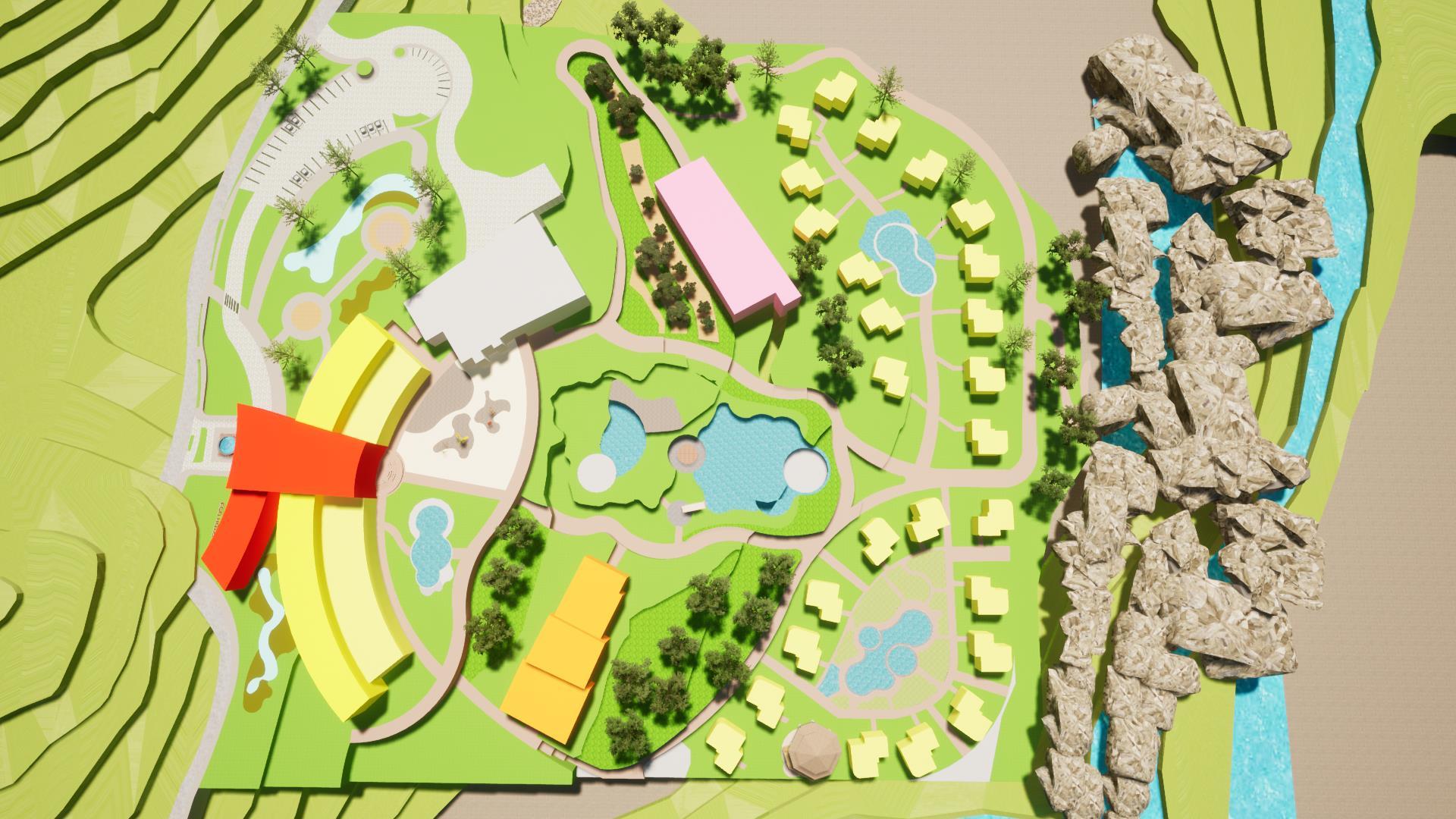 su materialidad. Ramifica la corriente del agua del terreno • Camino • Distribución Espacios Geometrización Catarata de citan SE RAMIFICA CREANDO DISTINTOS CAMINOS 1 3 RECEPCIÓN LEYENDA ZONA COMERCIAL HOTEL BUNGALOWS / HABITACIONES ZONA CULTURAL SPA+GIMNASIO BAR PISCINAS RESTAURANTE BUNGALOWS