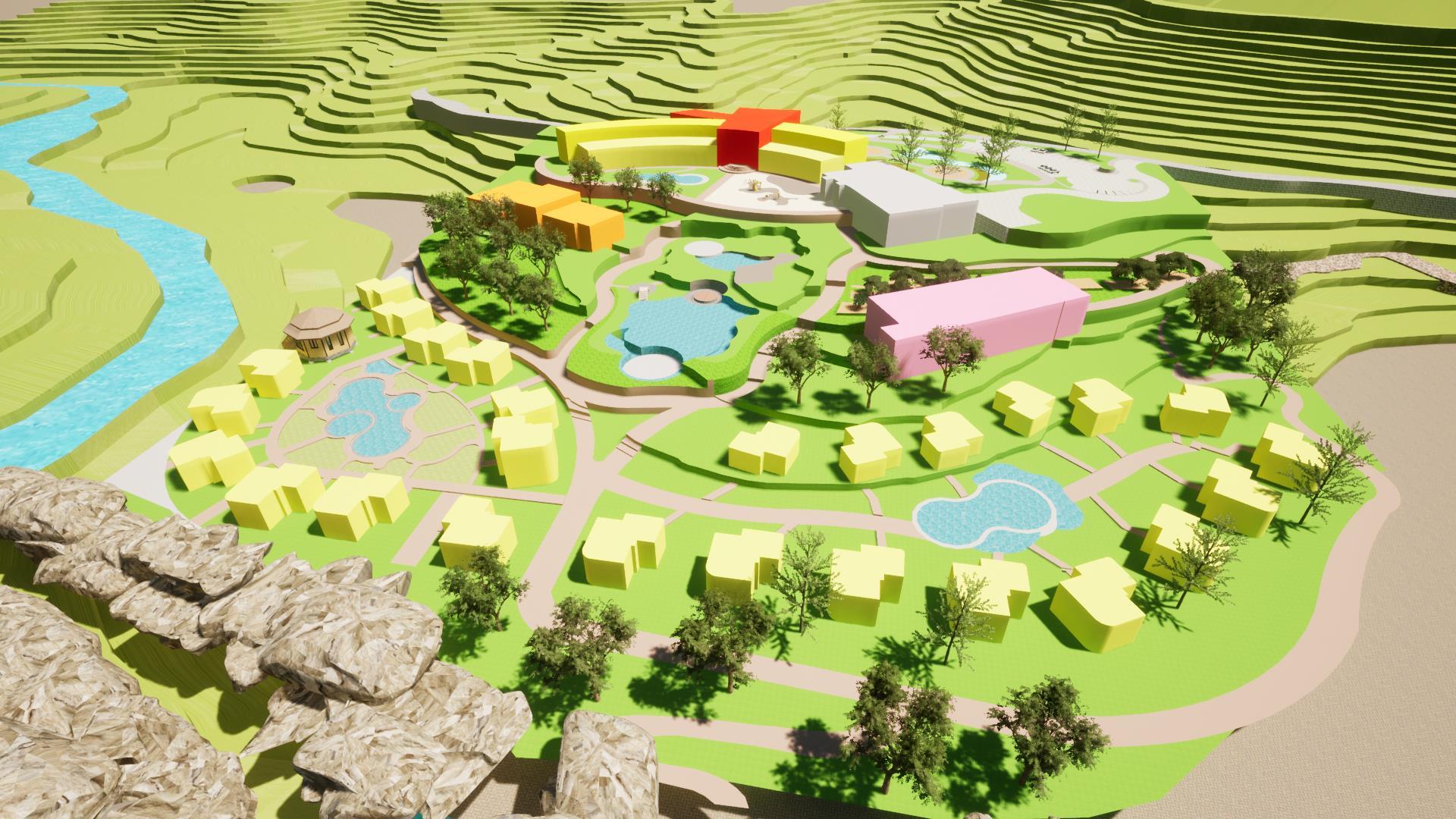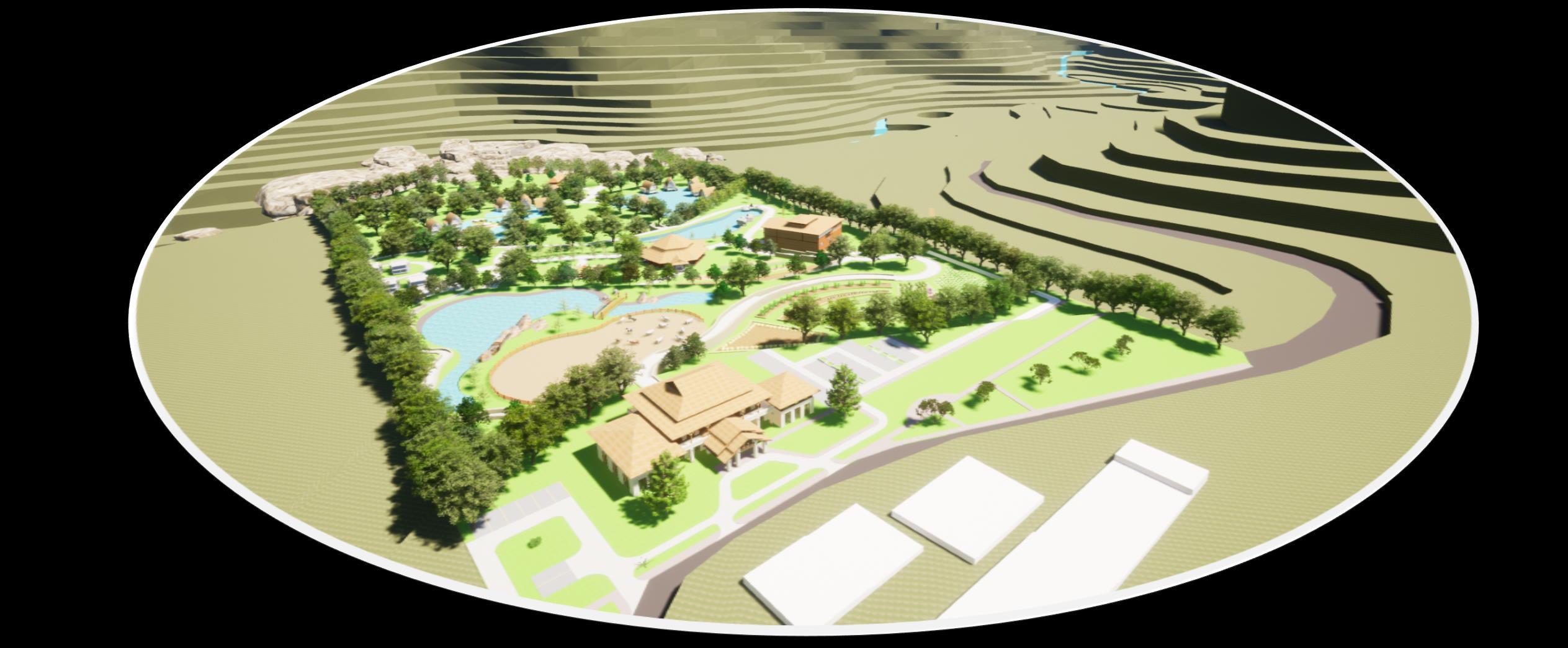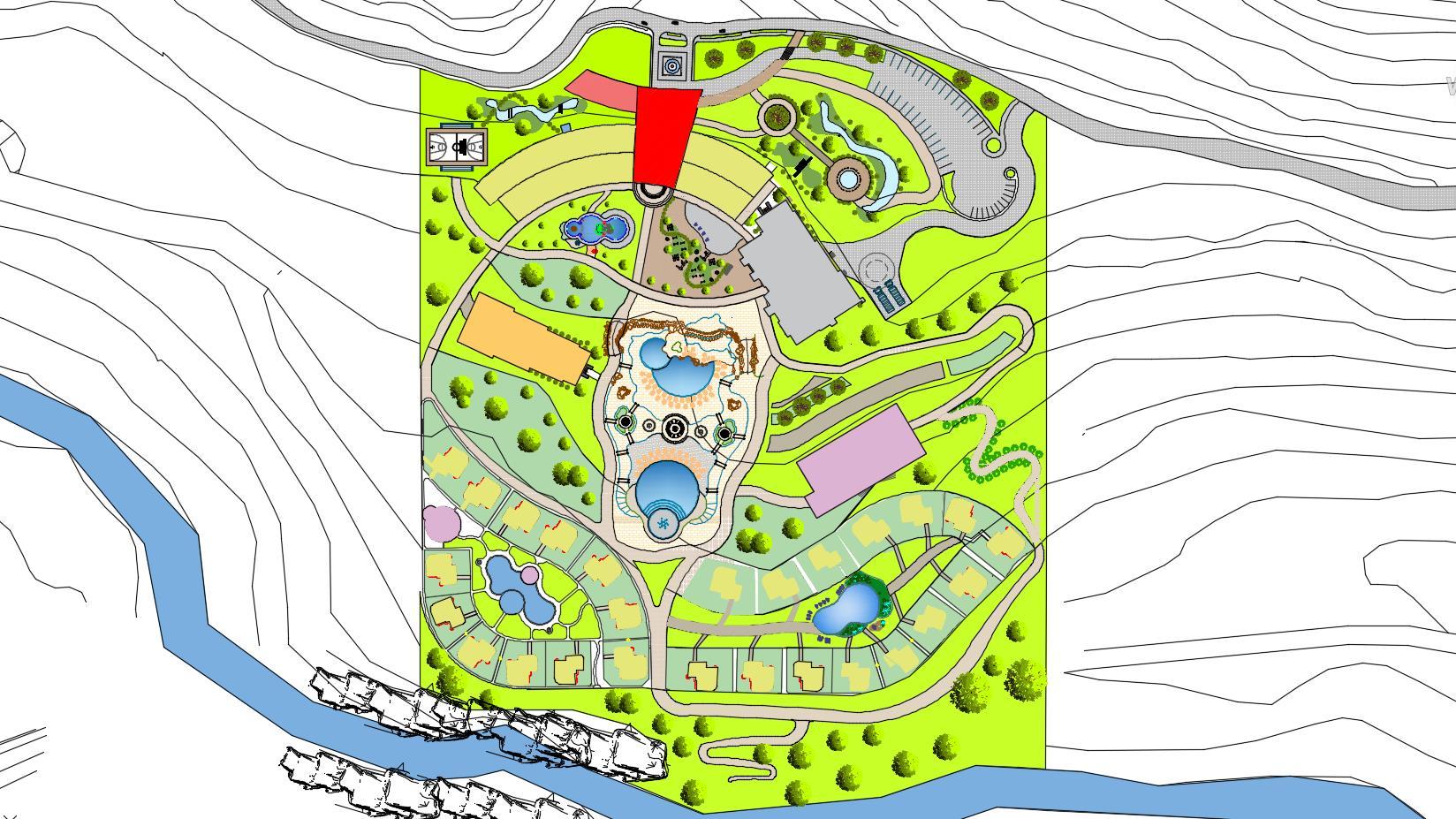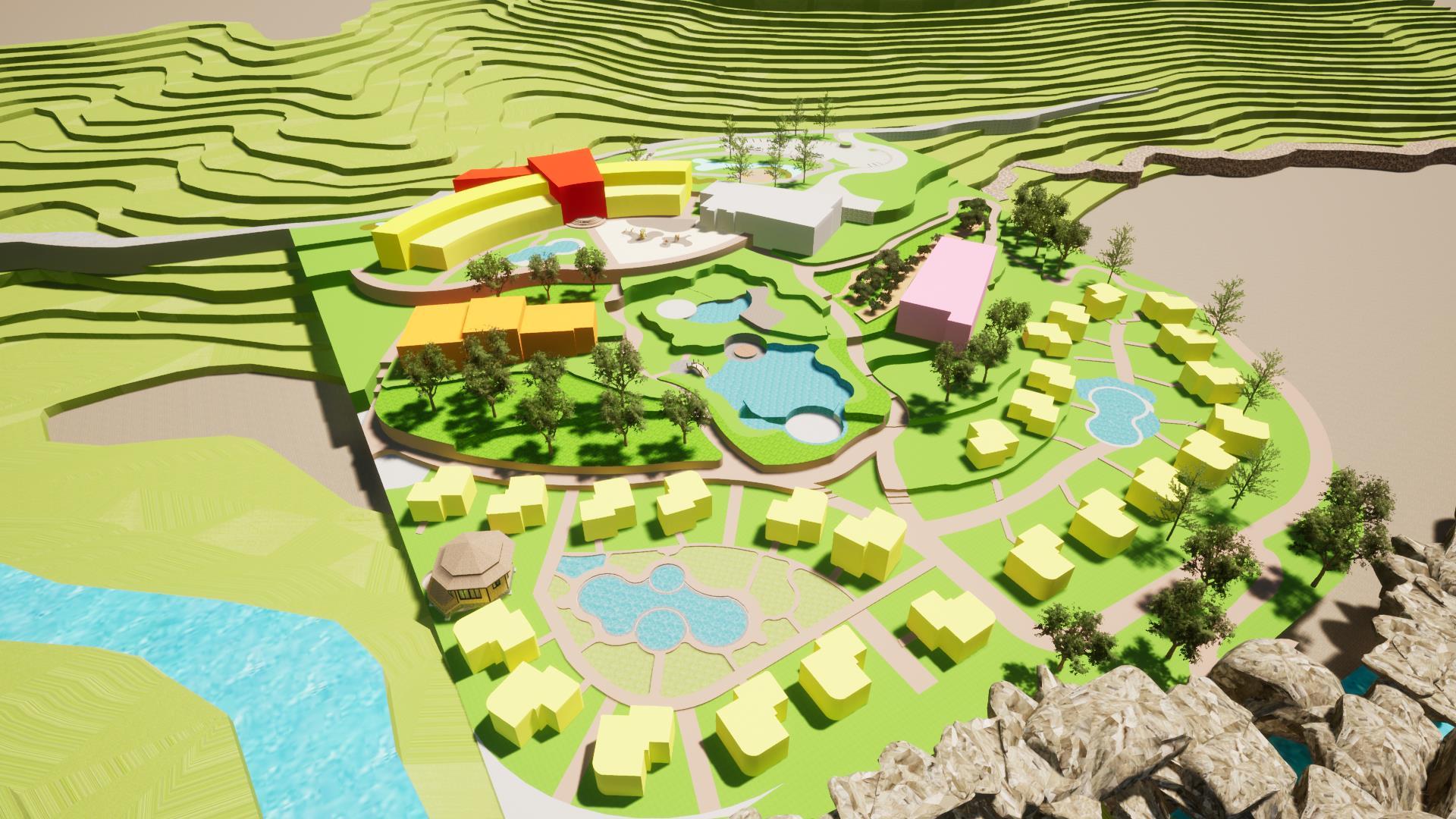 su materialidad. Ramifica la corriente del agua del terreno • Camino • Distribución Espacios Geometrización Catarata de citan SE RAMIFICA CREANDO DISTINTOS CAMINOS 1 3 RECEPCIÓN LEYENDA ZONA COMERCIAL HOTEL BUNGALOWS / HABITACIONES ZONA CULTURAL SPA+GIMNASIO BAR PISCINAS RESTAURANTE BUNGALOWS