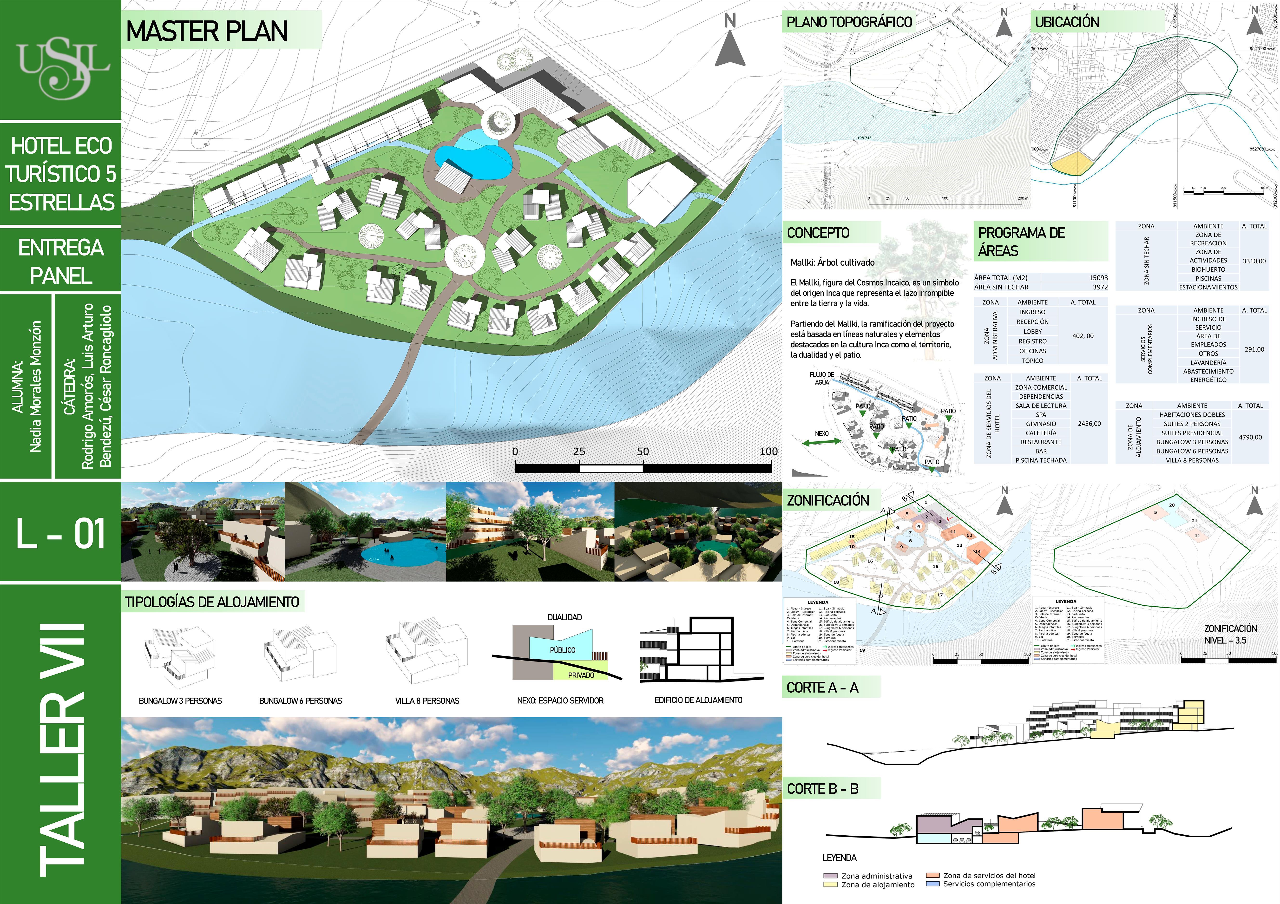 Sistema constructivoZonificación Tierra Lo ideal es utilizar la propia tierra que haya en el terreno. Cal Los romanos construían con cal y cualquier tipo de tierra CIMENTACIÓN MANGAS • SUPER ADOBE 2 4 1 2 3 4 ÁREA DE BOSQUE BIOHUERTO PLATAFORMA DEPORTIVA ZONA DE ESTAR Zonificación UNIVERSIDAD TECNOLÓGICA DEL PERU | UTP ALUMNOS: Alzamora Romero, Leila Roxany COD: 20207721 ARQUITECTOS: ARQ. KARLA PATRICIA PALACIOS GONZALES ARQ. RENSO RODRISH CARRASCO JOCOPE| FACULTAD: ARQUITECTURA TALLER DE DISEÑO ARQUITEC TONICO VI T ALLER DE DISEÑO ARQUITECTONICO VI L-01 INGRESO PRINCIPAL 1 ZONA DE INGRESO RECEPCIÓN + ZONA ADMINISTRATIVA 2 ZONA COMERCIAL 4 HABITACIONES 5 RESTAURANTE 3 8 9 4 7 6 ESTACIONAMIENTO BIOHUERTO SPA + GYM BUNGALOWS PISCINA HABITACIONES JUEGOS R. PISCINA Z. CULTURAL PISCINA Z. BOSQUE BAR BUNGALOWS 10 11 12 13 14 15 16