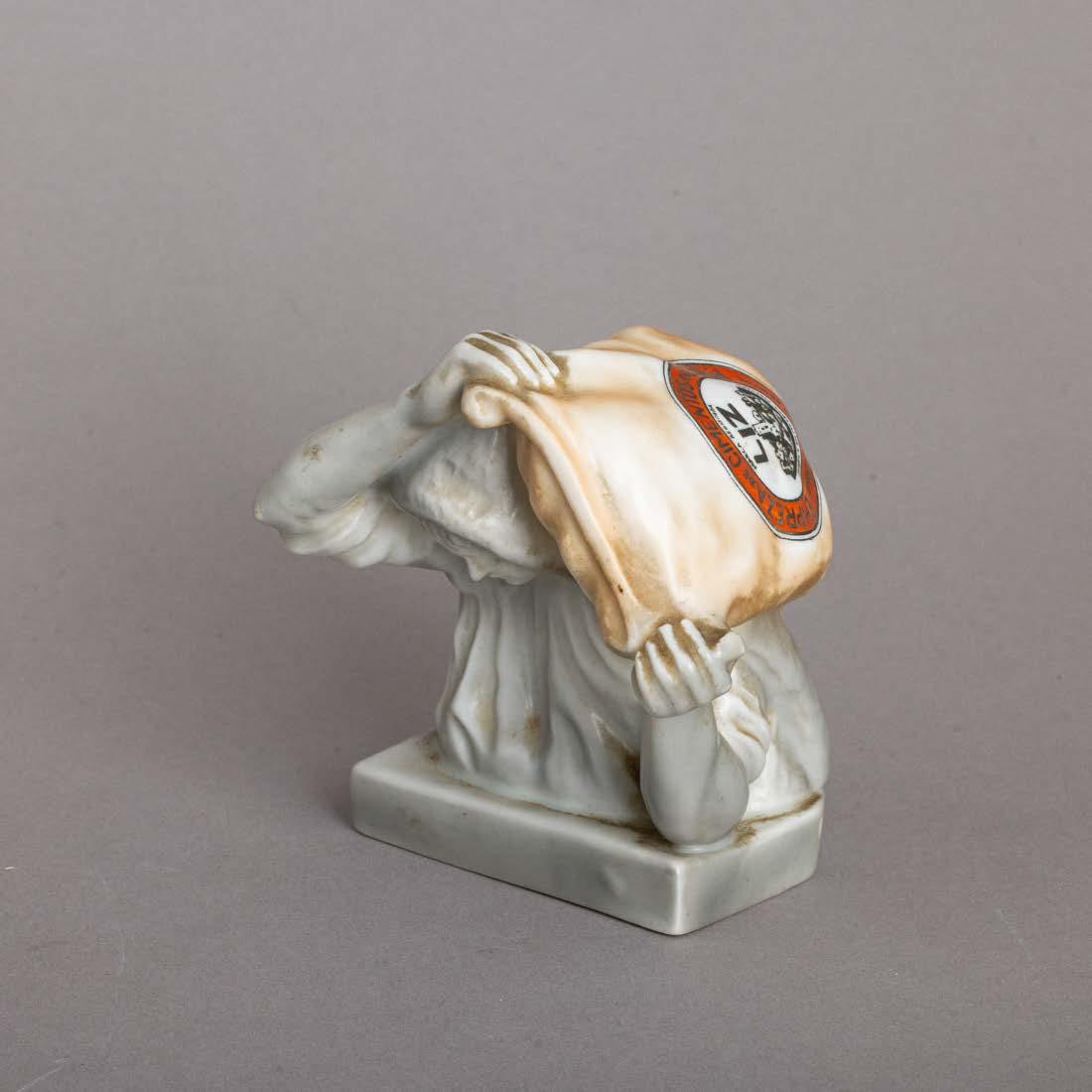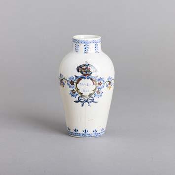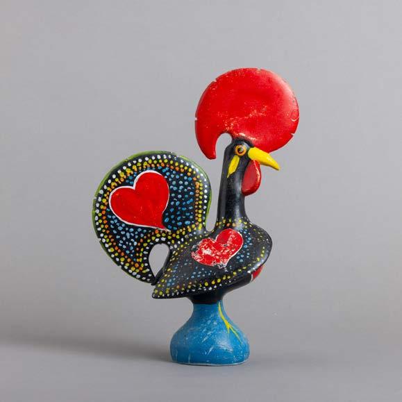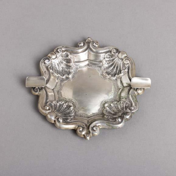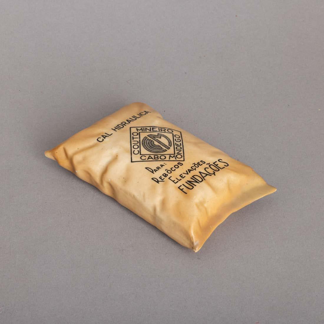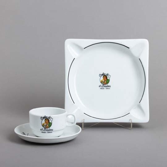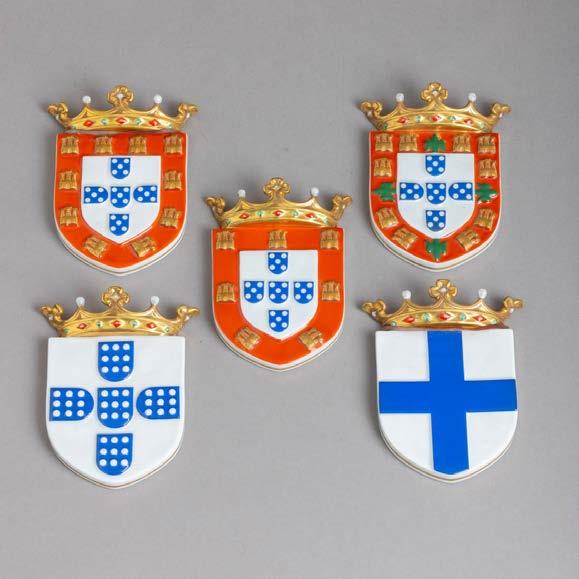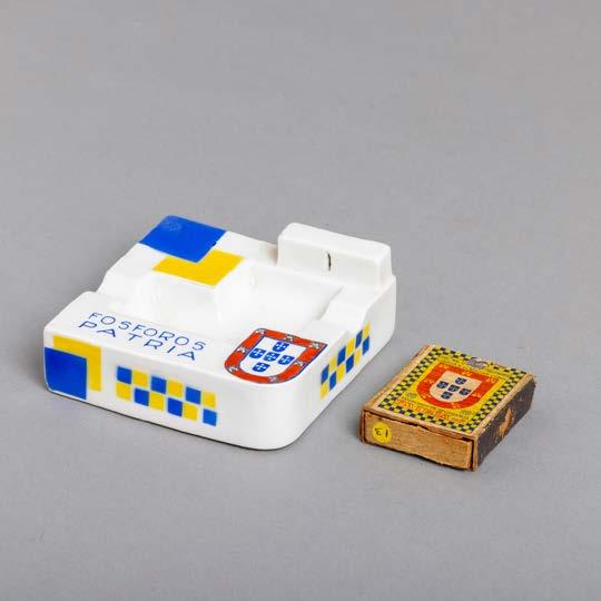 Em porcelana moldada (19241947), decoração policromada com armas portuguesas. Acompanha uma caixa de fósforos. Sinais de uso e pequeno defeito de fabrico.