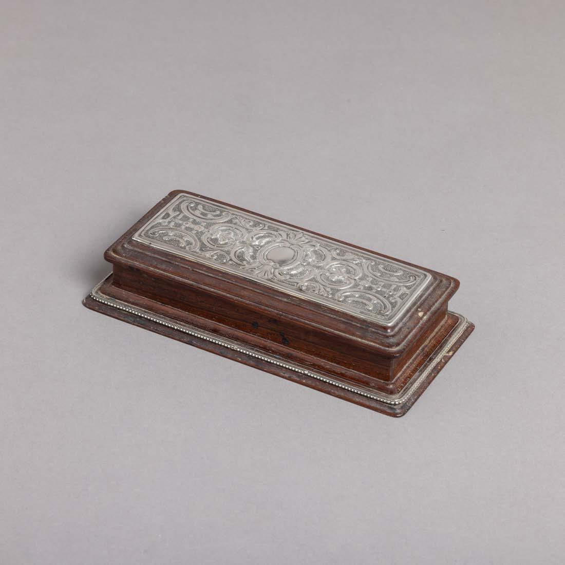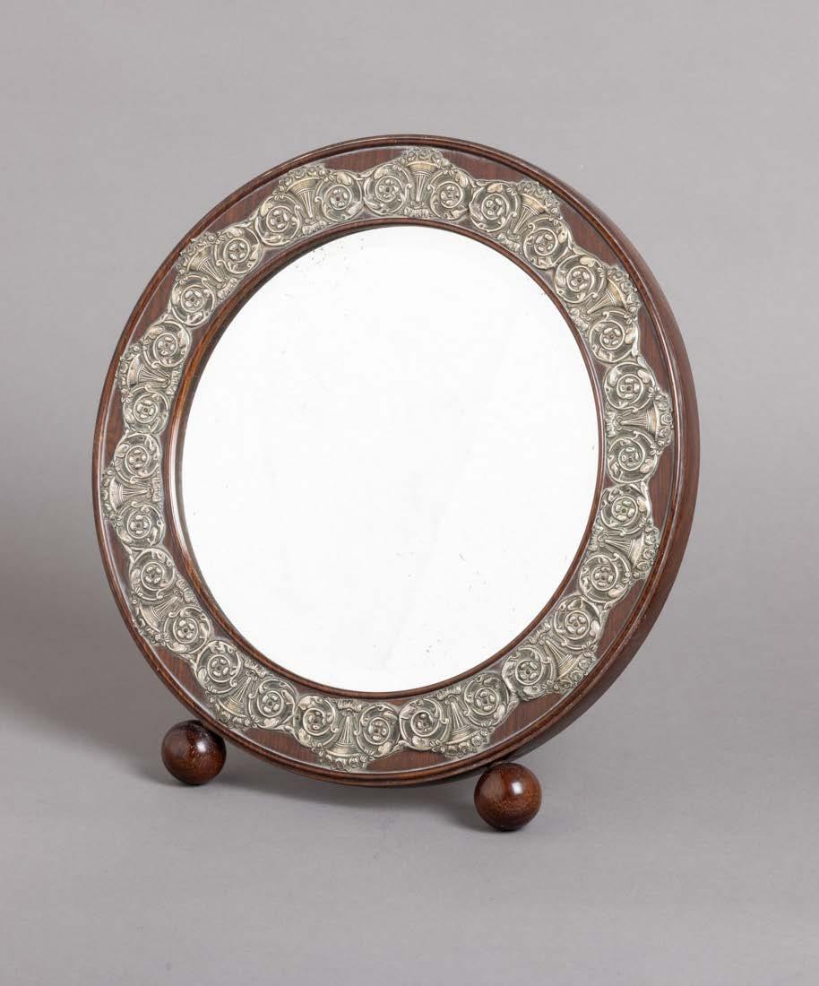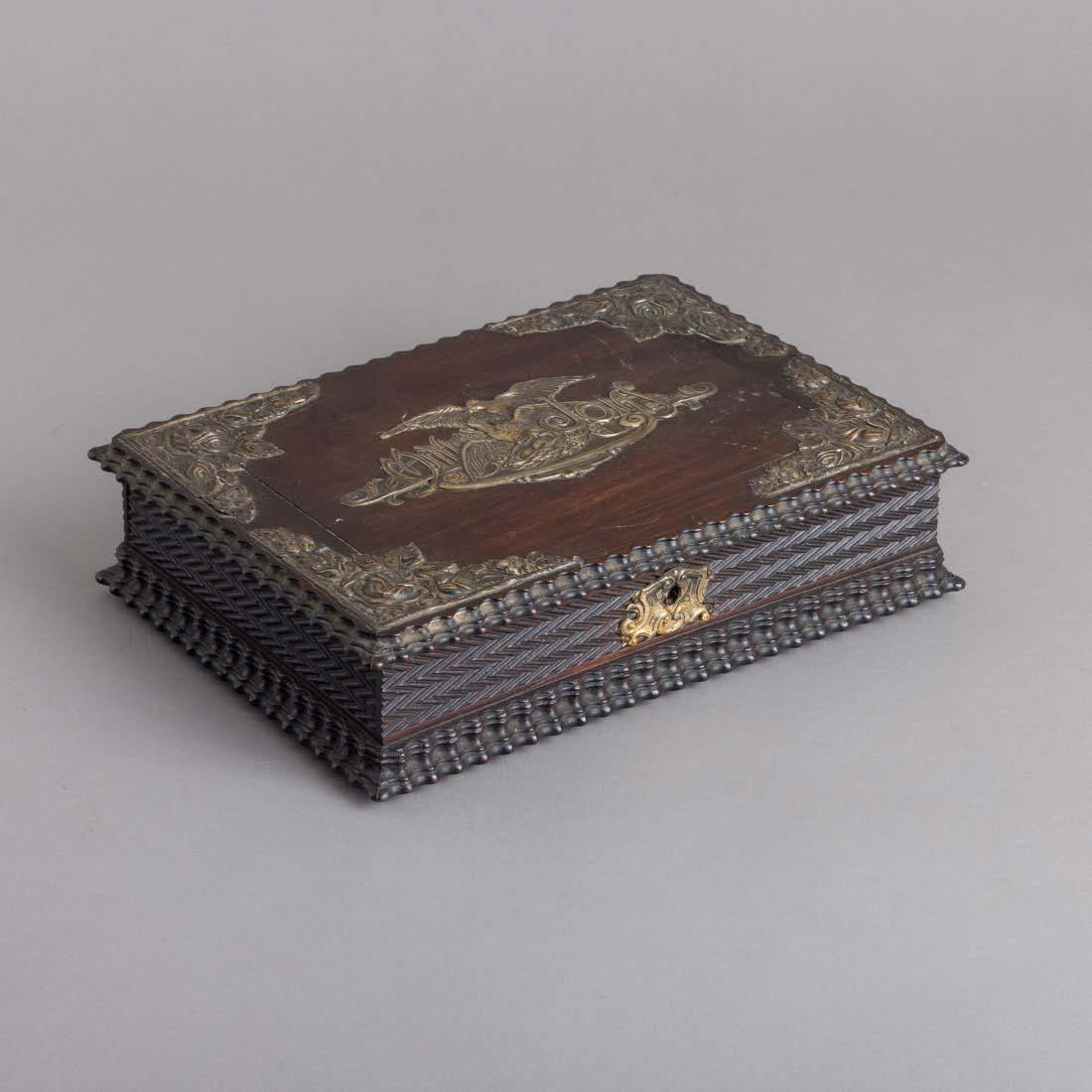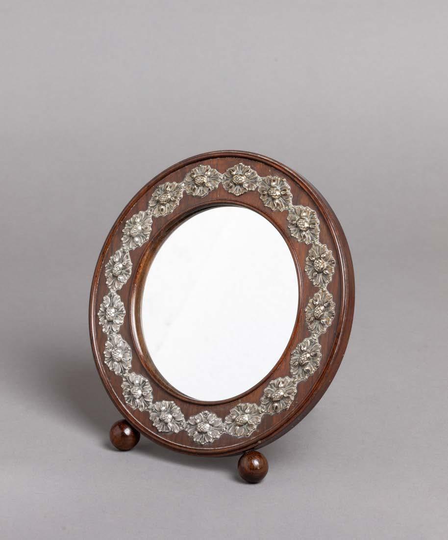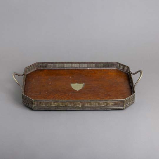 Fundo em carvalho, aplicação e gradinha em metal prateado, decoração vazada. Sinais de uso, leve oxidação e pequenos defeitos.