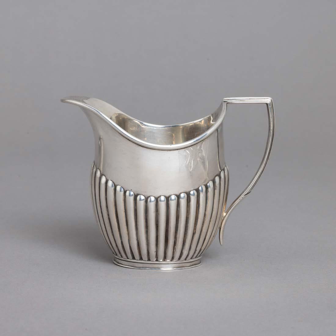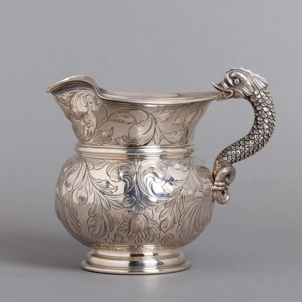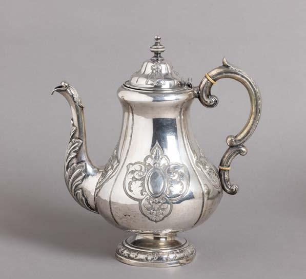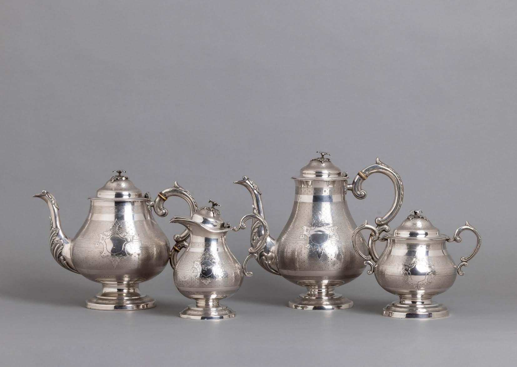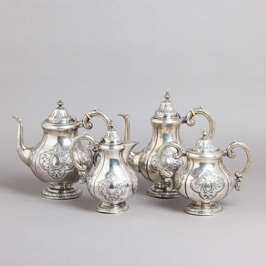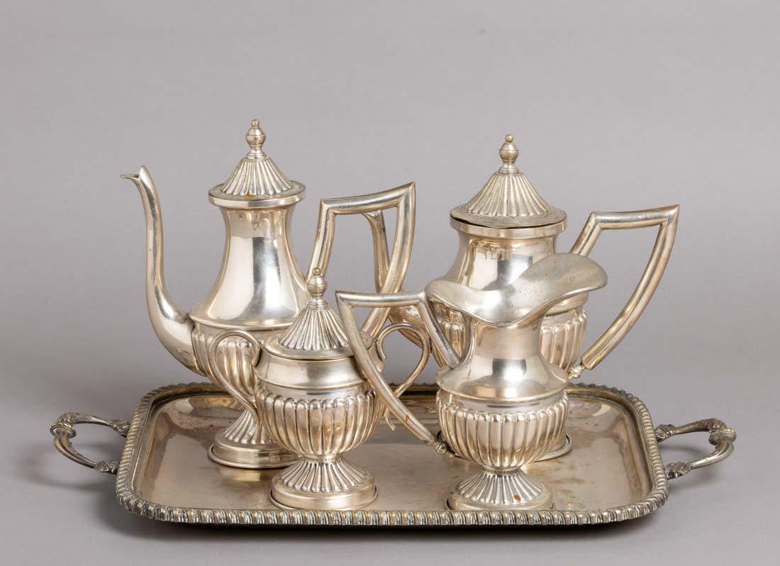 Em metal prateado, decoração gomada e relevada, composto por bule, cafeteira, leiteira e açucareiro.
