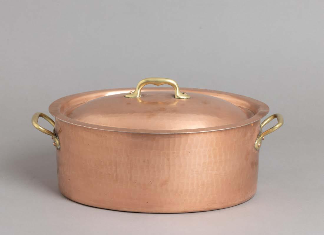 cobre martelado e estanhado no interior, pegas em latão. Sinais de uso e leve desgaste.