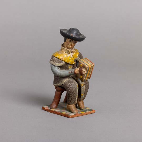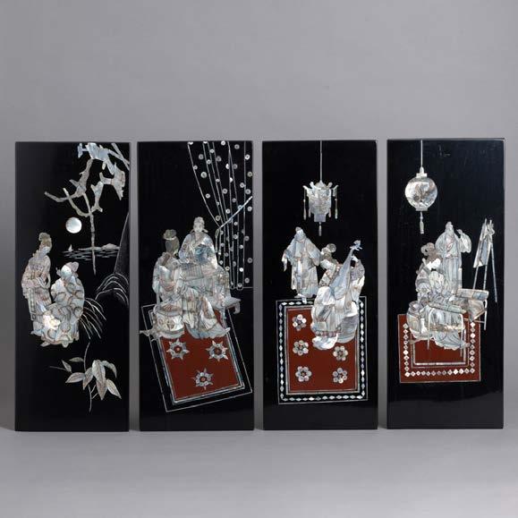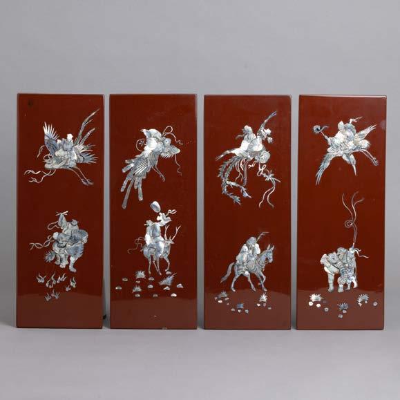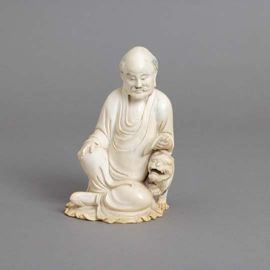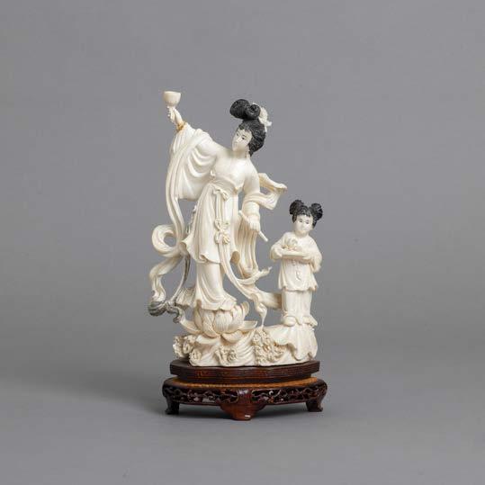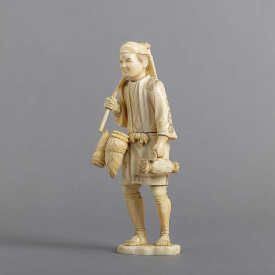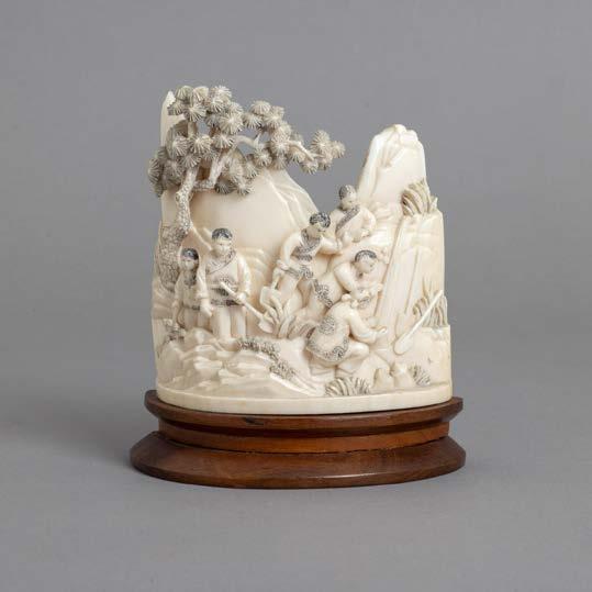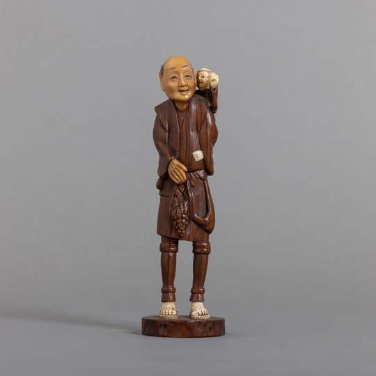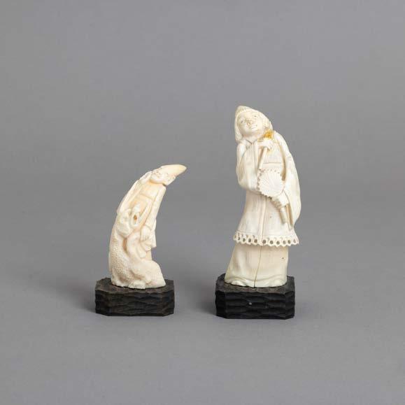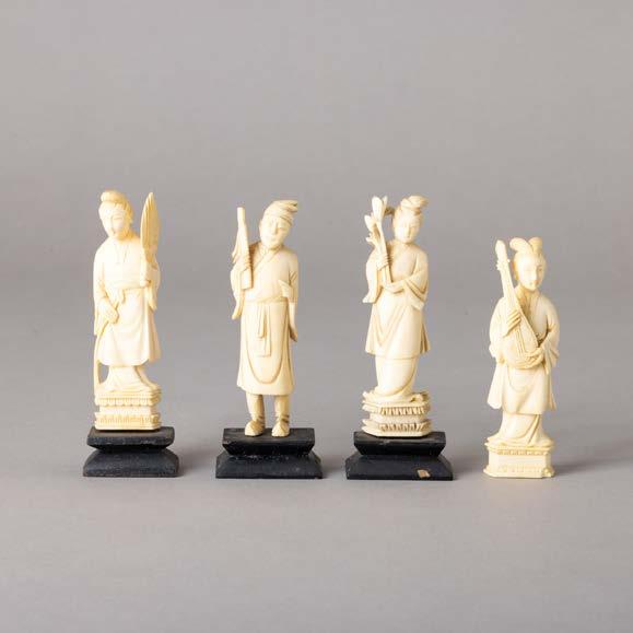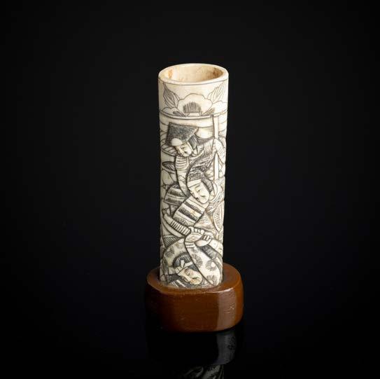 Em osso esculpido “guerreiros”, base em madeira lacada. Japão. Sinais de uso e falha.