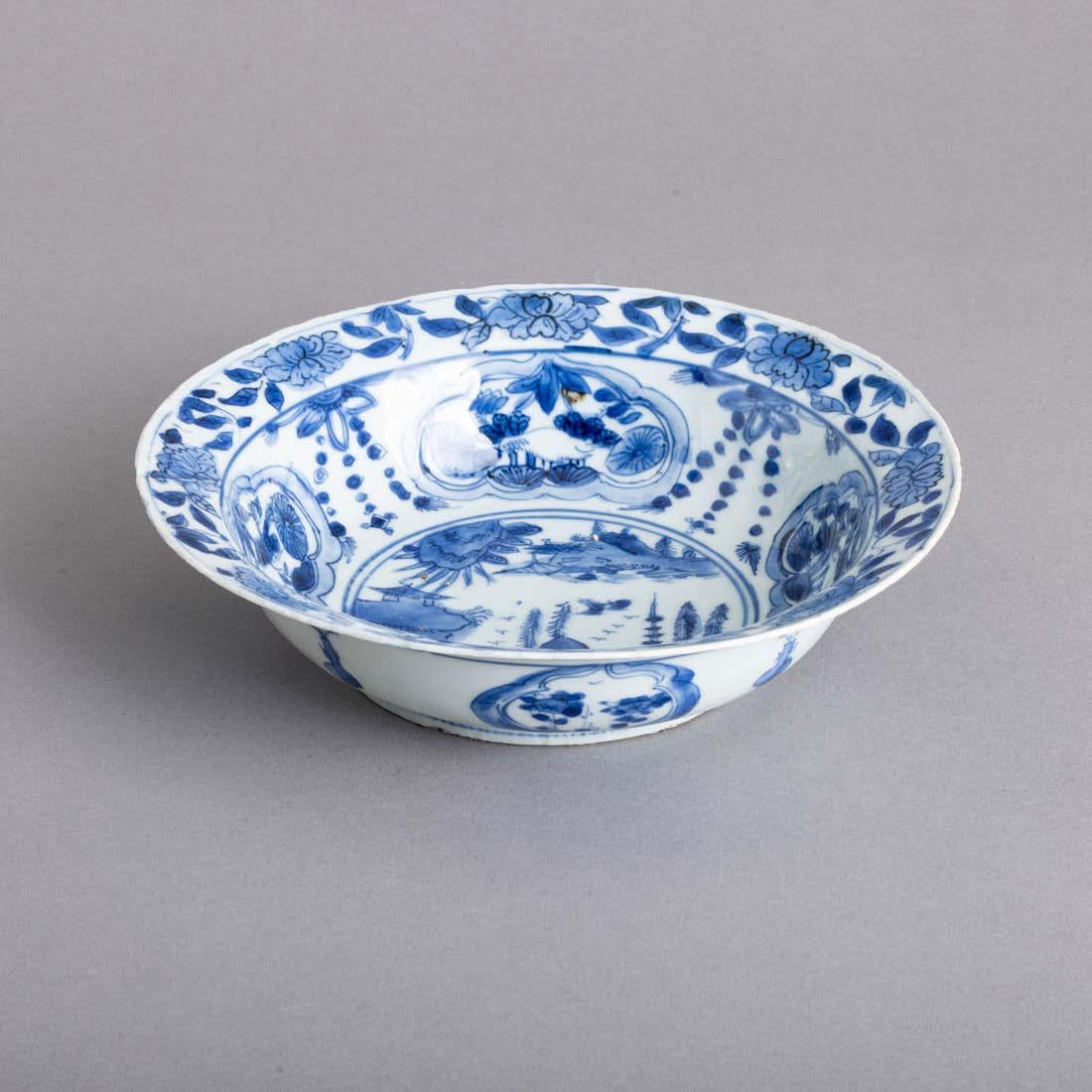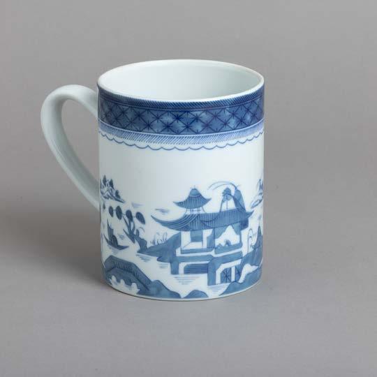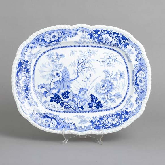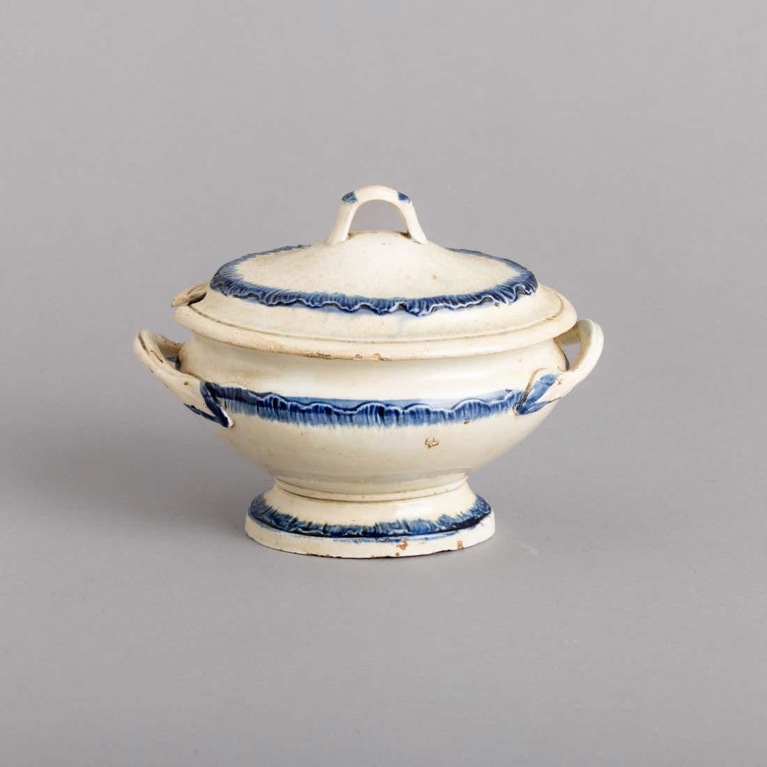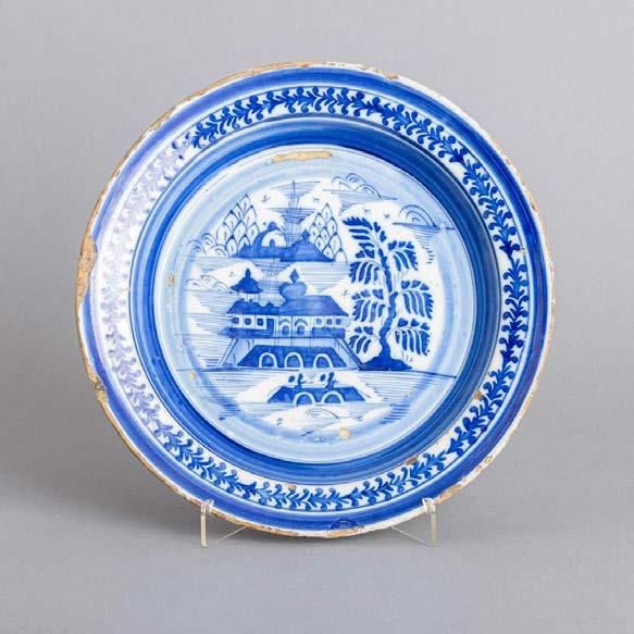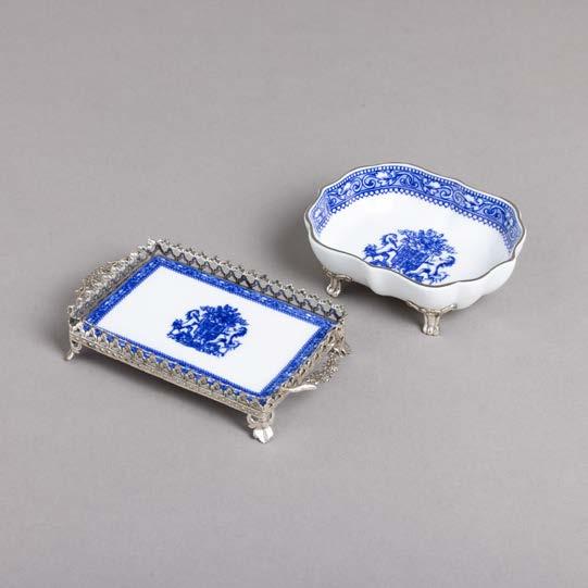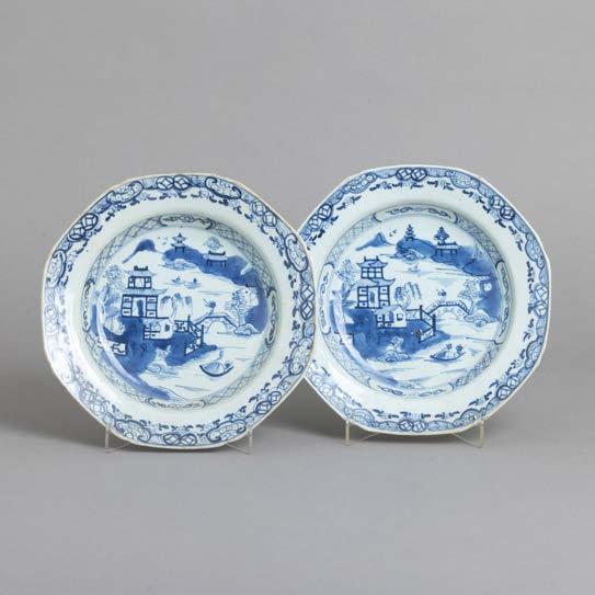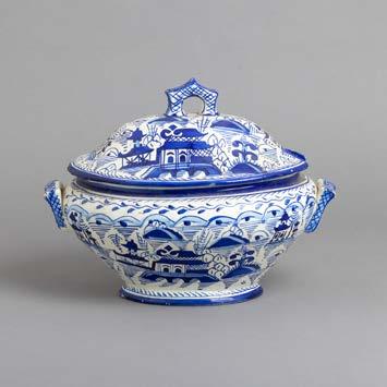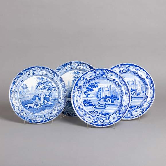 Em loiça pó de pedra inglesa, Davenport, decoração azul “Mosque and Fishermen” e “The Villagers”. Séc. XIX. Sinais de uso, craquelé e pequenos defeitos de fabrico.