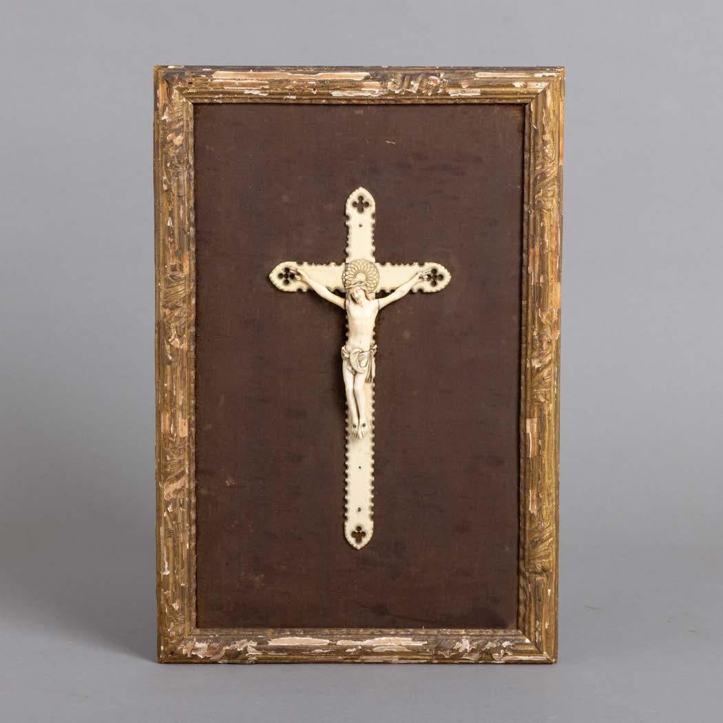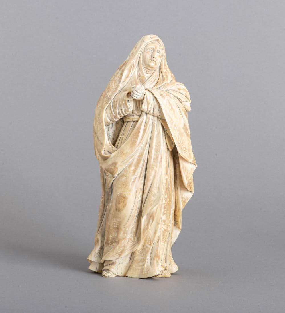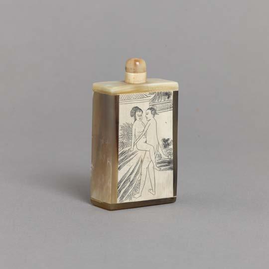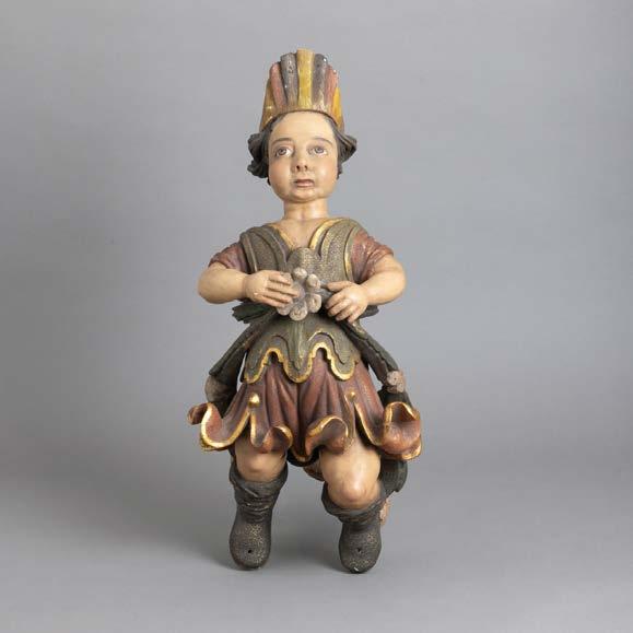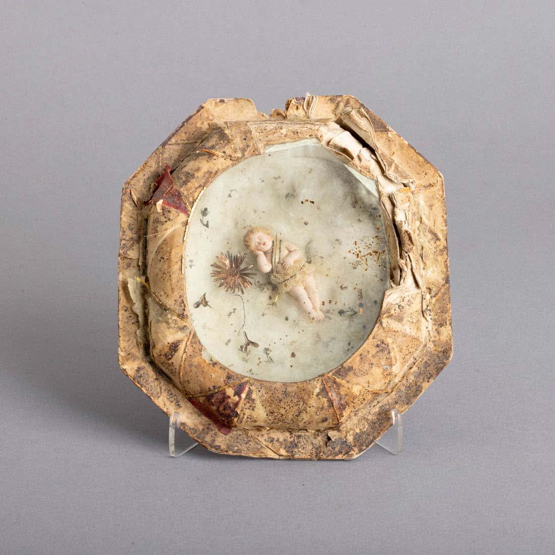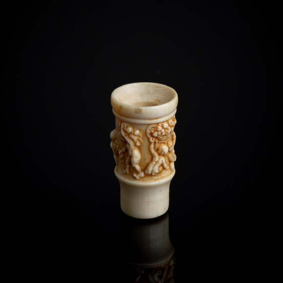 Esculpida em osso, decoração relevada “Putti com cestos de fruta”. Sinais de uso.
