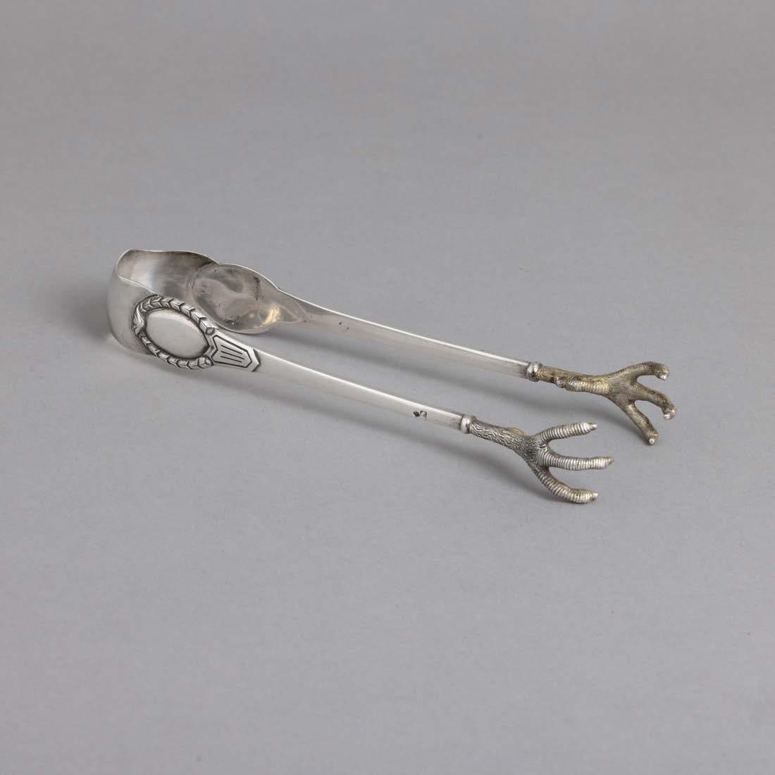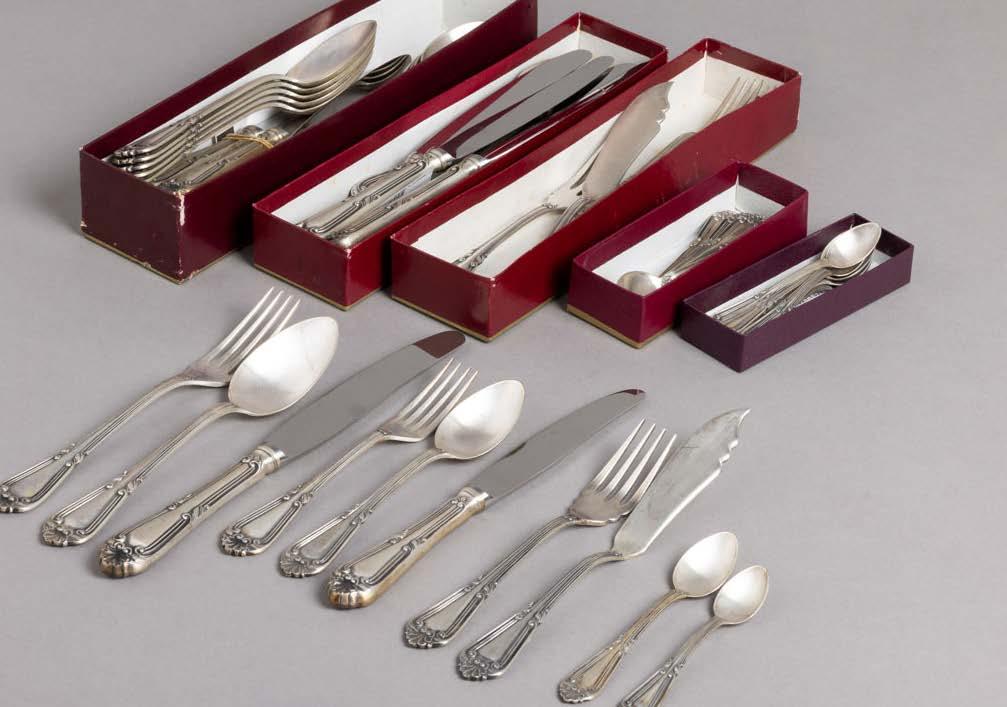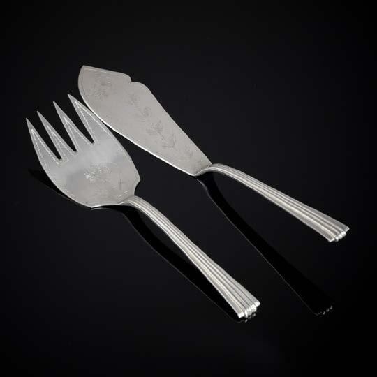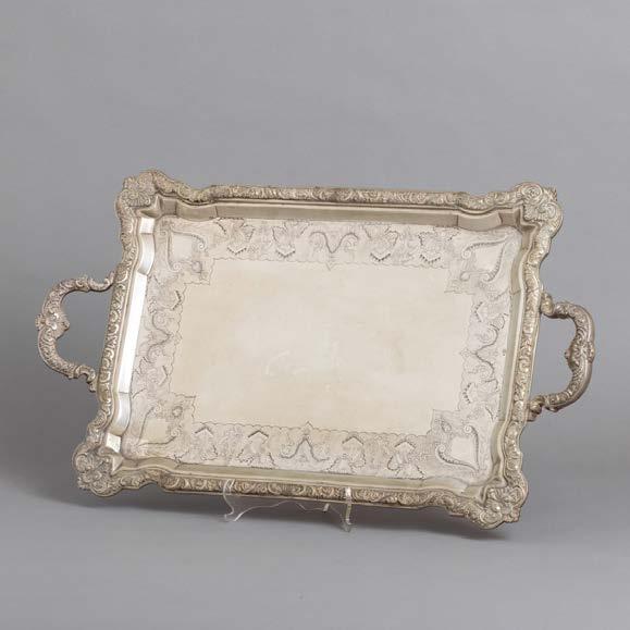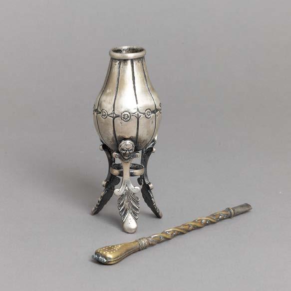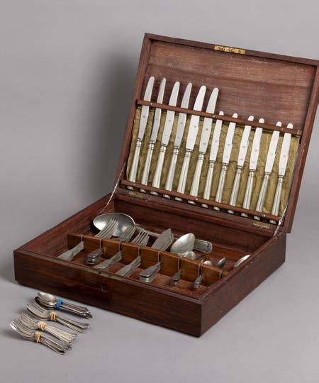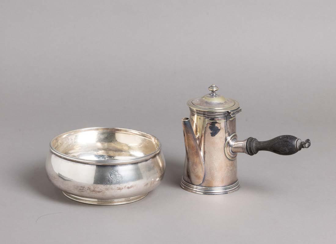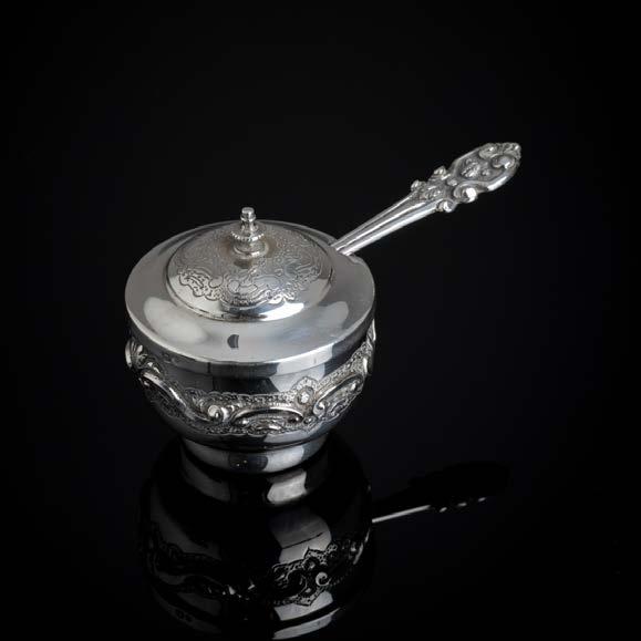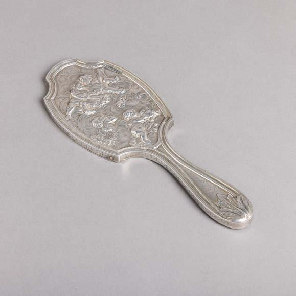 Em metal prateado Christofle e Halphen, pega em madeira torneada, decoração gravada e relevada, monogramadas. Sinais de uso, amolgadelas e desgaste.