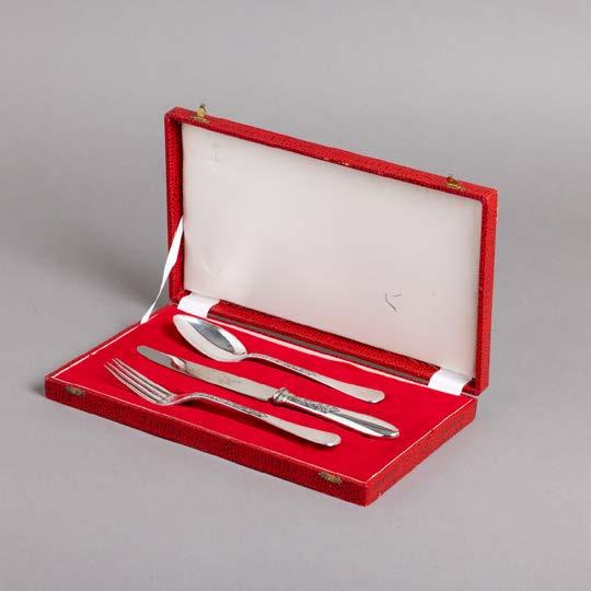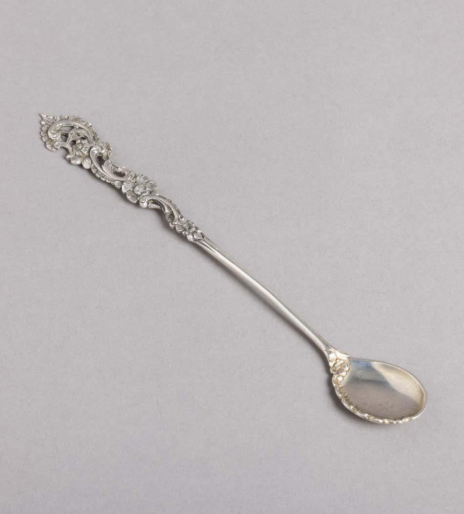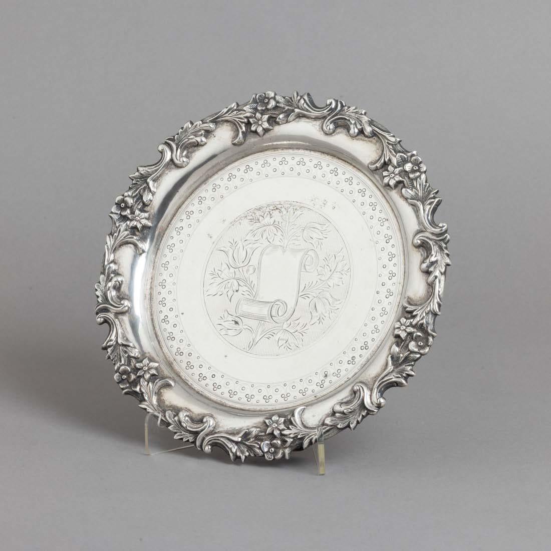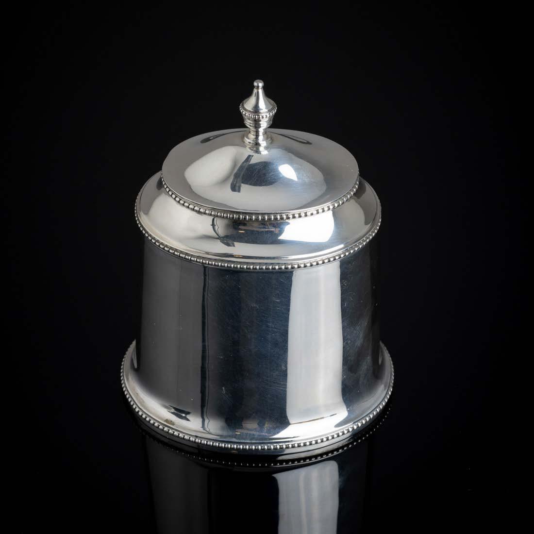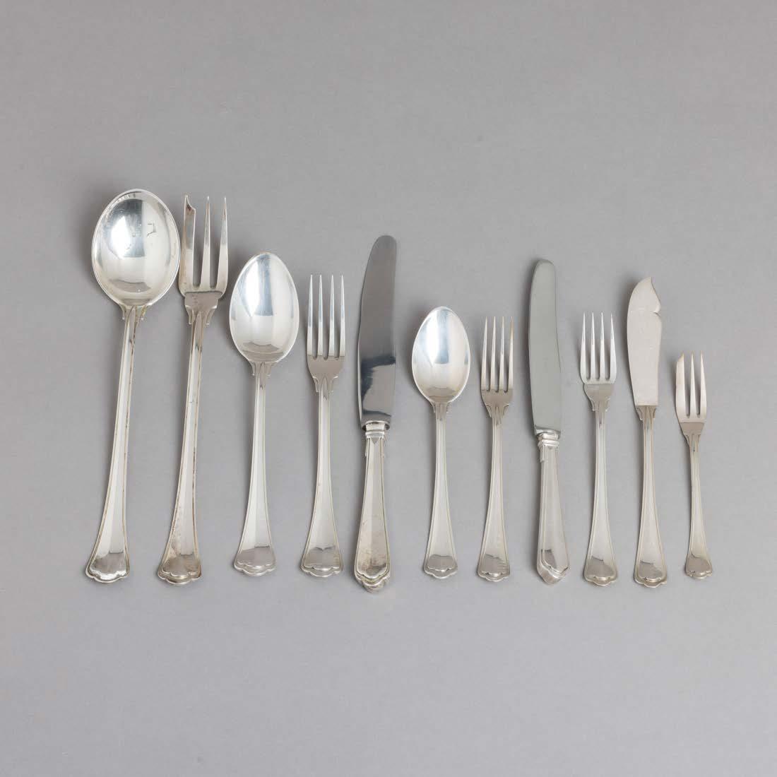 Em metal prateado Christofle e Halphen, pega em madeira torneada, decoração gravada e relevada, monogramadas. Sinais de uso, amolgadelas e desgaste.